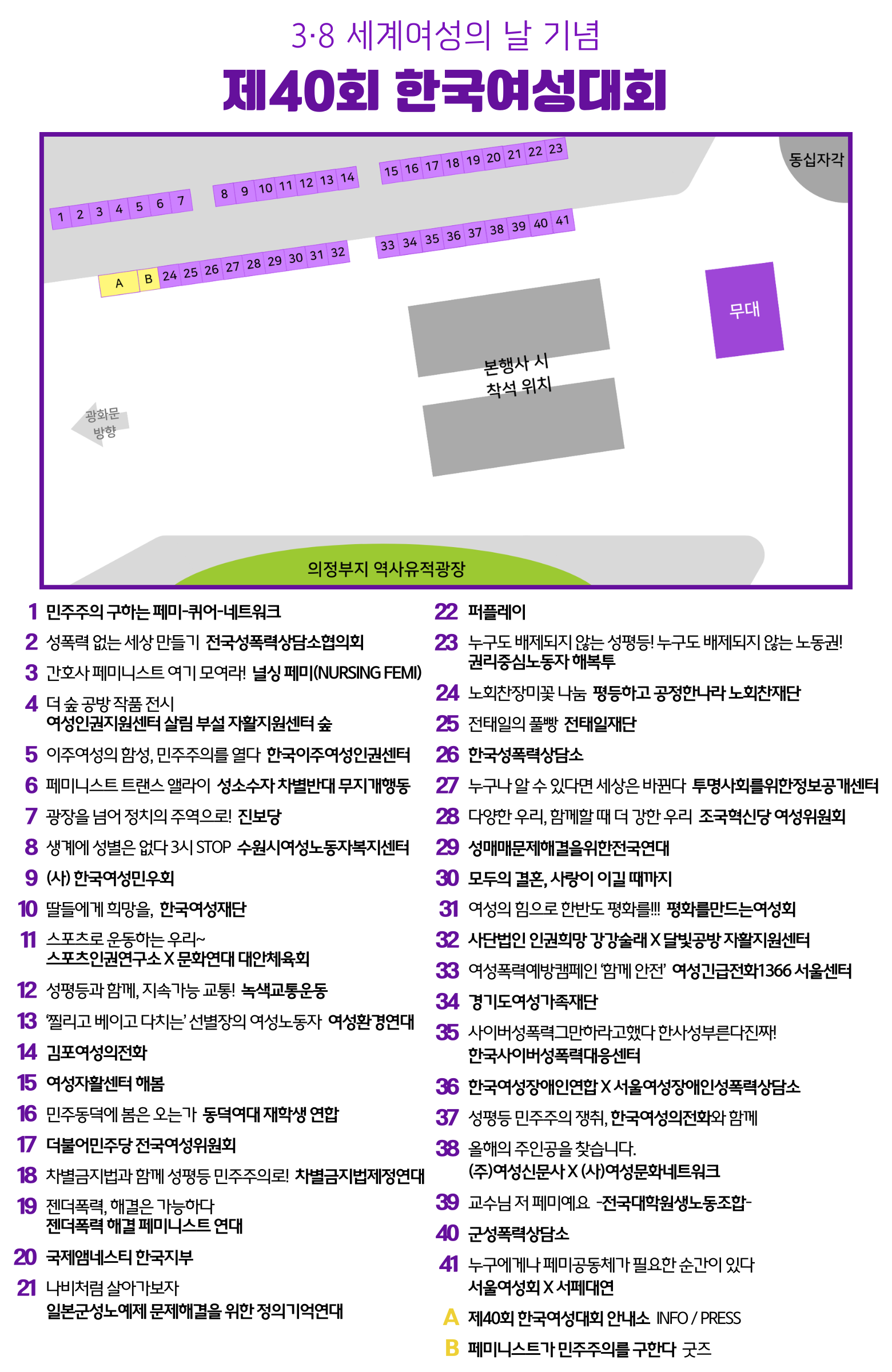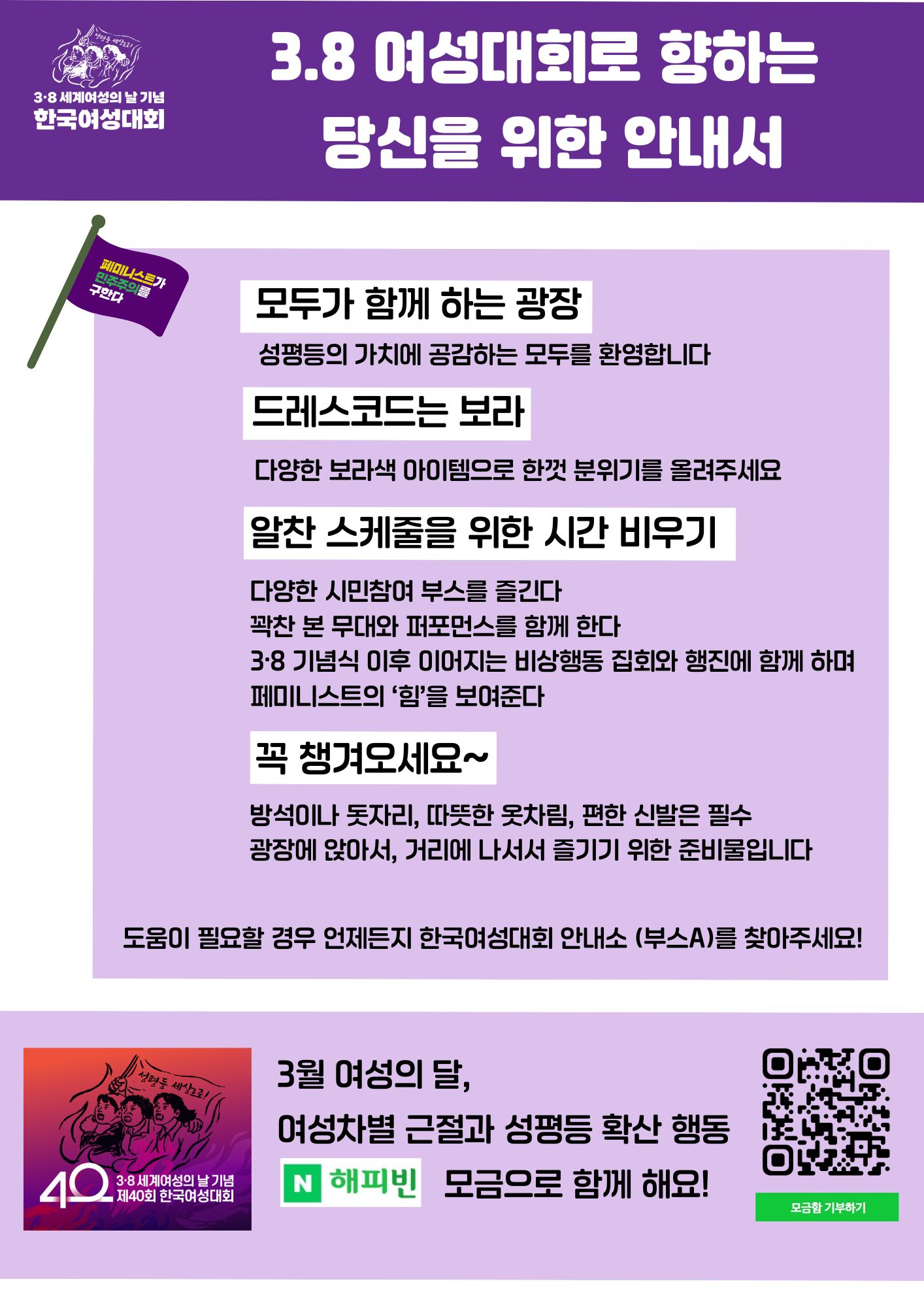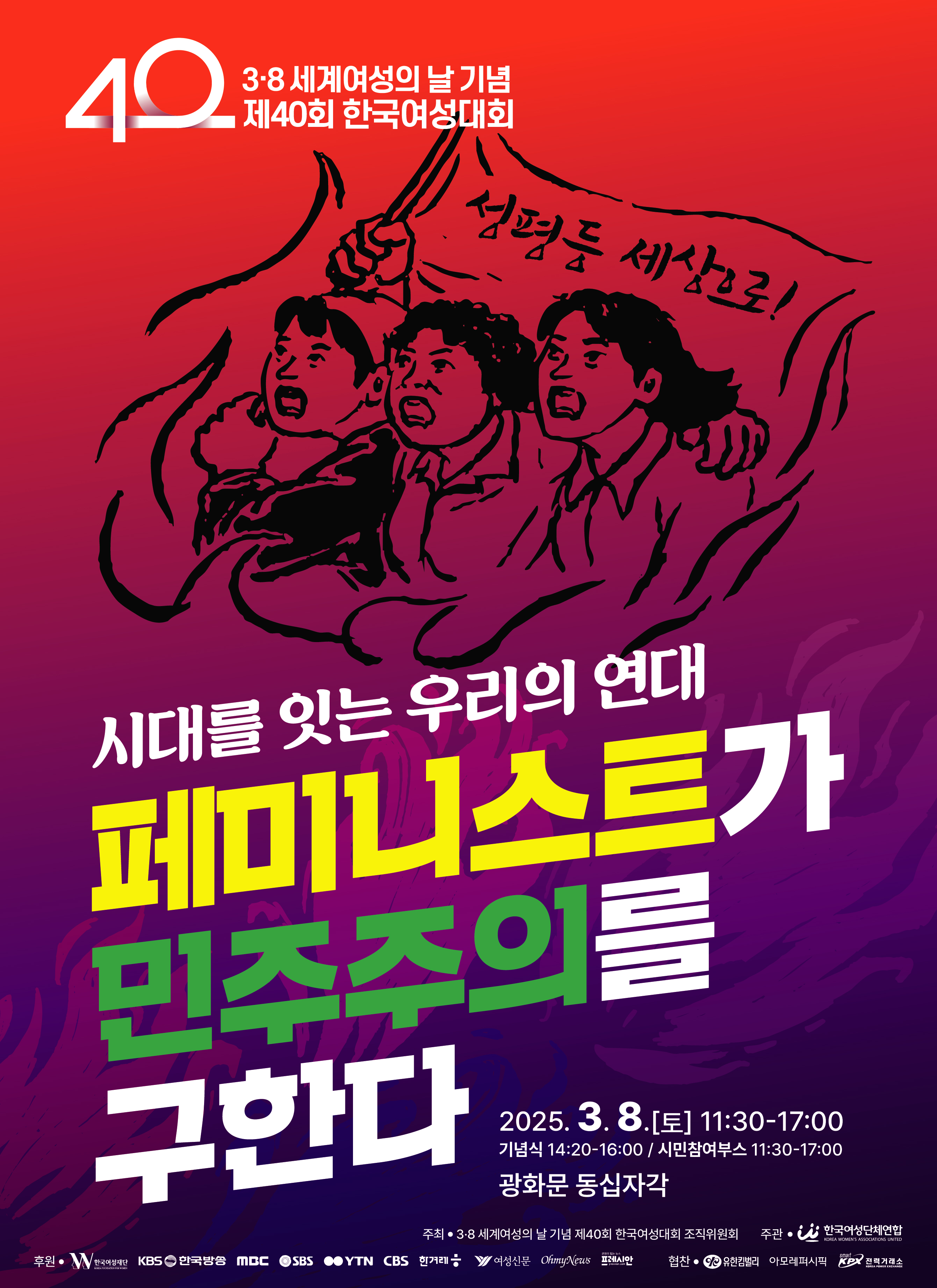 제40회 한국여성대회는 2025년 3월 8일(토) 오전 11시 30분 서울 광화문 동십자각에서 열립니다. 성평등 사회를 향한 다양한 단체들의 활동 소개와 다채로운 시민참여 캠페인이 펼쳐지는 43개의 ‘시민난장’이 열립니다. 성평등 민주주의를 구하기 위해 광장에 나와 전진하는 페미니스트의 연대를 몸소 경험하는 공간, 제40회 한국여성대회에 많은 관심과 참여를 부탁드립니다.