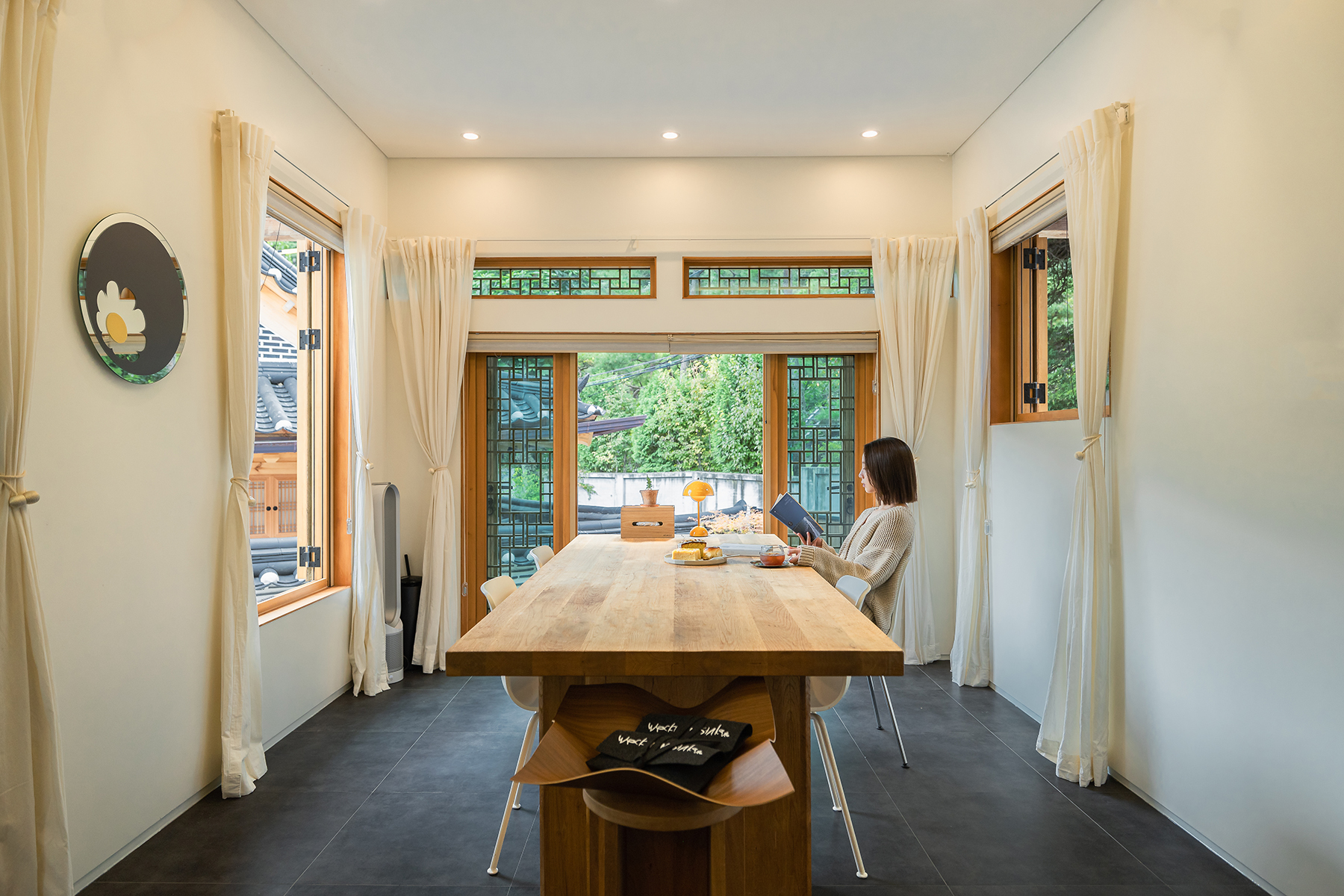 [이한욱 호스트] 다이닝룸을 겸하는 거실은 불필요한 것들은 모두 내려놓고 오붓하게 담소를 나눌 수 있는 공간입니다. 또 1층에서는 내가 만드는 소리를 온전히 느낄 수 있는 피아노실, 탁 트인 풍경을 마주한 마당의 테이블 등에 머물며 마음의 안정을 찾을 수 있어요.