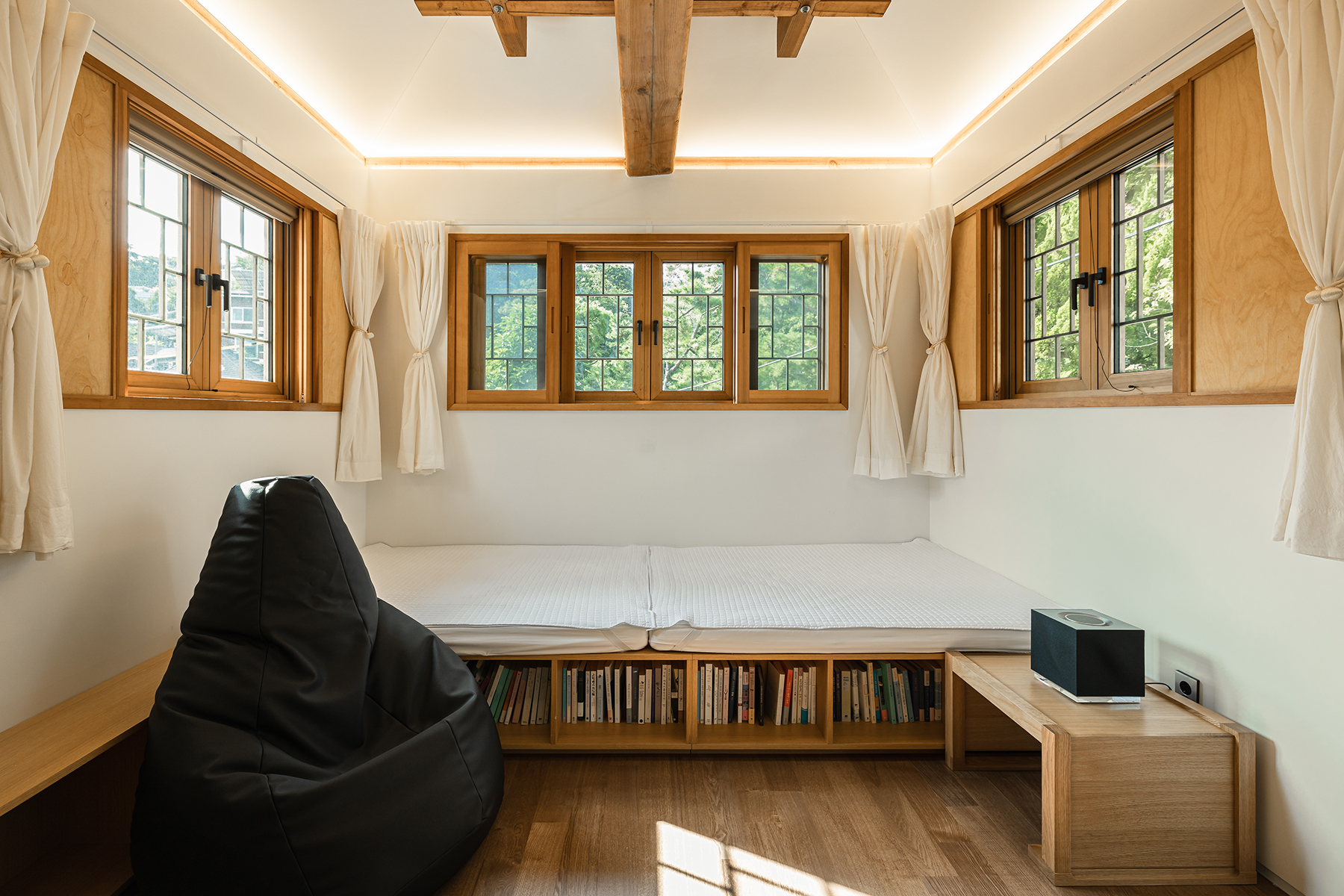 모던한 공간에 포인트가 되는 디딤돌을 밟고 2층으로 올라서면 침실과 작은방이 나타납니다. 채광이 좋고 아름다운 풍경이 액자처럼 비추어요. 특히 2층의 서재 겸 침실에서는 그림을 그리거나 음악을 들으며 독서를 하는 등 여러 활동이 가능합니다.