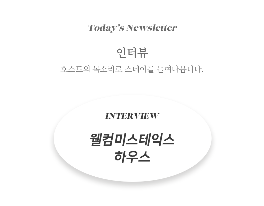 [이한욱 호스트] 처음부터 지금까지 손님들께 적어드리는 글귀가 있습니다. ‘당신의 실수를 환영합니다’ 언제나 같은 자리에서 변함없이 서 있지만 오는 순간마다 다른 느낌을 선물해 드리고자 노력하는 스테이가 되겠습니다. 향후 이벤트로 연주회나 전시회도 계획 중이고, 또 '웰컴미스테익스'라는 브랜드 아래 더욱 다양하고 재미있는 실수를 하기 위해 준비 중이에요. 더욱 재미있는 실수를, 많이 할 수 있도록 노력하는 웰컴미스테익스하우스가 되도록 하겠습니다. |