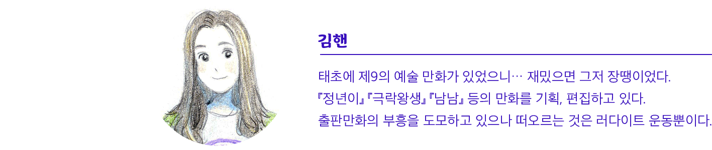 "너는 그래도 만화를 좋아하잖아." "일로 해봐. 다 똑같아…" 대체 왜일까. 이런 이야기를 들을 때면 강하게 부정하고 싶다. 하지만 그렇다면서요? 우리 밀레니얼 세대는 일보다는 워라벨을 중시하는 개인적이고 유연한 사고를 지닌 세대라면서요? 일을 너무 좋아하는 건 촌스러운 거라던데요? 결국 나는 결혼하면 마지못해 불행한 척 하는 사람들 같이 말을 한다.