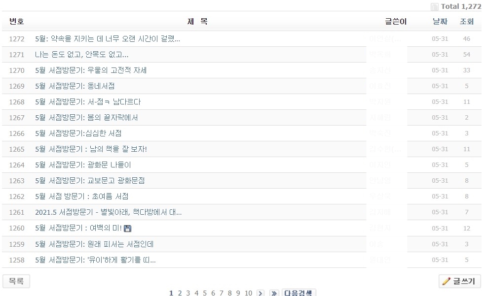 오랜 세월 축적 된 '서점방문기' 게시판입니다. 매월 말일이 가까워오면 그 달의 서점방문기가 업데이트되지요. 모든 문학동네 일꾼들이 서점방문기를 쓰고, 서점방문기에는 주목할 신간, 내가 꼽은 이달의 책, 서점에 대한 총평 등의 내용을 담습니다. 서점방문기와 문학동네의 교정 교열을 관장하는 오독 편집자님께 그 유래를 물어봤습니다. 문학동네 임직원의 서점방문기 그 시작 2005년 1월 29일 대표이사의 발의로 2월부터 시행되어 2021년 현재까지 근 20년간 이어져오고 있는 제도입니다. 매월 1회 이상은 주말이나 휴일, 휴가(독서휴가 포함)중에 대형서점이나 동네서점, 지방서점, 도서전, 북페스티벌, 외국 서점 등을 방문한 후 방문기를 인트라넷 ‘서점방문기’ 코너에 올리면 다음달 소정의 수당을 지급받을 수 있습니다. 또한 일 년마다 자기계발비를 받으려면 서점방문기를 꼭 써야 하지요. 서점방문기에 꼭 들어가야 할 내용 문학동네 임직원들이 쓰는 서점방문기의 형식은 자유로운 편이지만 반드시 아래 다섯 가지 사항은 꼭 기입하도록 하고 있습니다. 뭉친님도 이 가이드를 참고해서 서점을 찾는다면 어느 때보다 알찬 방문이 될 거예요! 서점방문기를 써보셔도 좋고요.