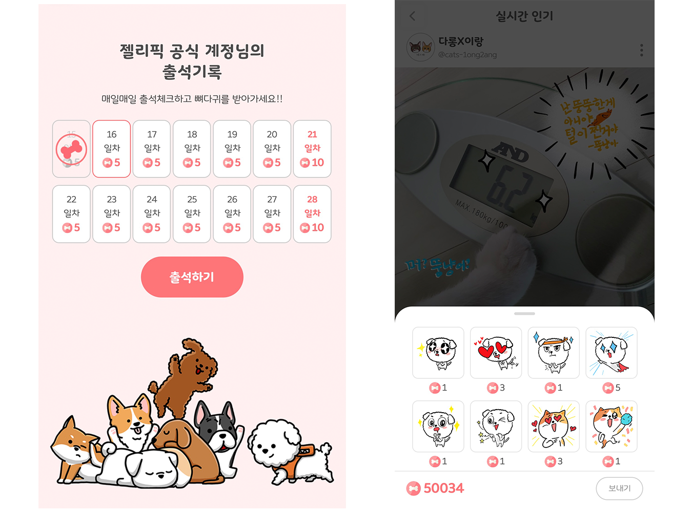 📢 뼈다귀는 젤리픽 앱 활동(챌린지 참여, 출석, 산책 등)으로 얻는 포인트입니다. 뼈다귀를 사용하여 마음에 드는 게시물에 귀여운 캐릭터 리액션을 보내실 수 있어요. 뼈다귀의 사용처는 앞으로도 확장될 예정입니다. 💌 이번 주 미션 Clear! 구독자님, 그럼 이번 한 주 동안 모든 미션을 잘 달성하시기를 젤리픽이 진심으로 응원합니다! 이렇게 쉽고 재미있는 챌린지를 4주간 완료하시면, 푸짐한 선물을 드리고 있어요. 2주차 끝날 때까지 미션을 달성 못하시면 이후의 3주차 미션부터는 함께하실 수 없으니 꼭 참고 부탁드려요. 앞으로 저희 젤리픽 미션, 끝까지 따라와 주실 거죠? 그럼 행복한 한 주 보내시고, 다음 주에 또 만나요~ 👋👋 |