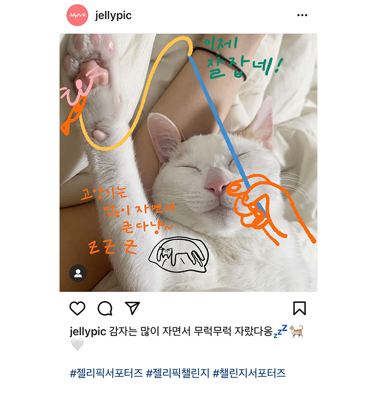 5. 인스타그램, 블로그에 자랑하기 (필수) 일주일 동안 열심히 챌린지에 참여했다면, 마음에 드는 사진을 1개 이상 인스타그램 또는 블로그에 자랑해주세요! 인스타그램의 경우 #젤리픽서포터즈 #젤리픽챌린지 #챌린지서포터즈 해시태그를 달아주시고, 저희 젤리픽 공식 계정(@jellypic_official)도 태그 부탁드려요~ 블로그의 경우 1기 서포터즈 쎄이네 블로그 후기↗ 를 참고하세요😉 ![]() ![]() [추가 미션] 원하는 분만 참여하시면 되어요~