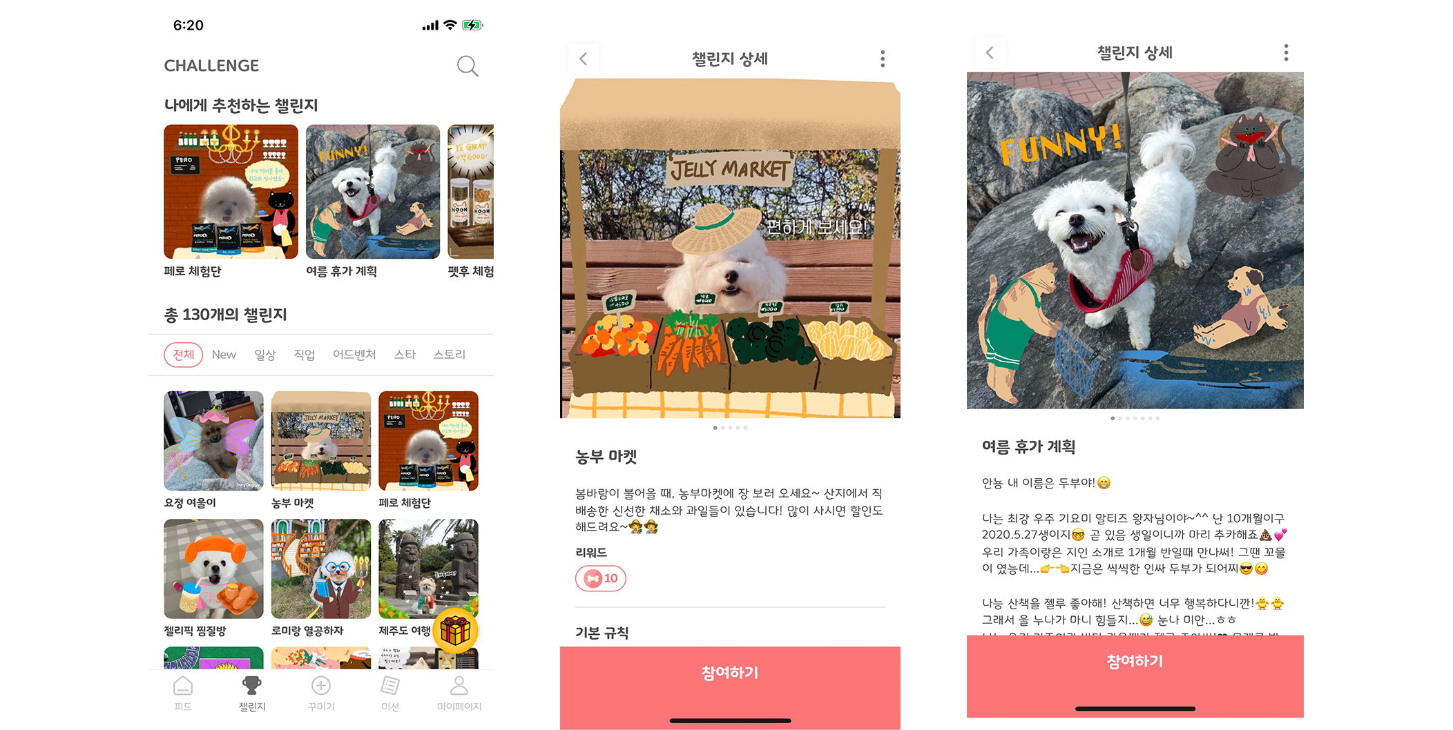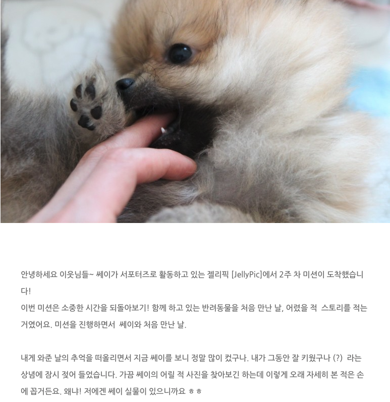 ![]() 2. 집에 온 사연 (필수) 고이 간직하고 있던 첫 만남의 추억을 꺼내주세요. 아기 때부터 가족과 함께 했던 친구의 이야기도, 보호소에서 가족을 만난 친구의 이야기도 환영합니다. "🍒 안녕 친구들아, 내 이름은 체리야! 원래 난 우리 언니 조카네 멈머였는데, 울 언니가 날 너무 좋아해서 언니 집으로 오게 되었어❤ 집에 어떻게 오게 되었는지 너희들의 사연이 궁금해!"![]() 3. 귀염뽀짝 어린시절 (필수) 아기 동물들은 하루가 다르게 쑥쑥 자라지요! 🌱 귀염뽀짝 챌린지에 놀러오셔서 어린시절 사진을 자랑해주세요."🍼 안녕 젤리픽 친구들! 나는 킹찰스 유자라고 해!! 나 어릴적에 엄청 귀여웠지?? 너희들도 나처럼 자랑하고 싶은 뽀시래기 사진이 있다면 귀염뽀짝 챌린지에 보내줘~" 4. 원하는 챌린지에 참여 (필수 3개 제외하고 2개 이상) 구독자님, 여기까지 잘 따라와 주셔서 감사합니다! 이제 원하시는 챌린지에 자유롭게 참여해보세요. 챌린지 탭에 가시면 상상초월 귀엽고 다양한 챌린지들을 만나실 수 있답니다~ 이렇게 필수 챌린지 3개, 자유 챌린지 2개, 이렇게 총 5개 챌린지에 참여해주셔야 하는 것, 꼭 잊지 마세요.