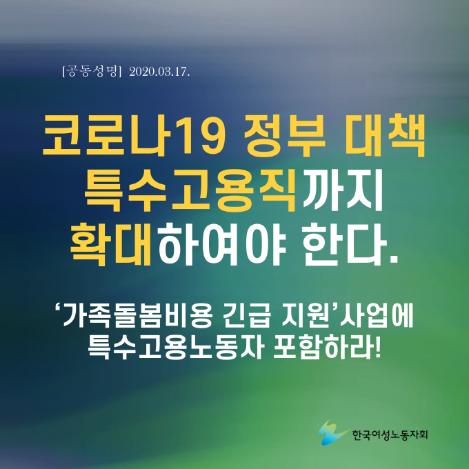 ![]() [공동성명]위기상황 대처, 공공성 확보가 답이다 -코로나19의 최일선, 돌봄노동자의 안전과 생계를 보장하라! -문재인 정부는 공공요양기관 확대하라! ![]() [공동성명]코로나 19 정부 대책 특수고용직까지 확대하여야 한다. - '가족돌봄비용 긴급 지원'사업에 특수고용노동자 포함하라! ![]() [코로나 사태 극복을 위한 노동·시민사회의 제언] 1.정부는 재난 수당 지급 등 과감한 재정확대에 나서야 한다. 2. 정부는 공공의료기관 확충을 더 이상 미루어서는 안된다. 3. 유급·돌봄 휴가의 실질적 보장과 취약계층 노동자의 지원 대책을 마련해야 한다. 4. 마스크 등 의료보호 용구의 공적 관리와 무상 배급을 제안한다. 5. 시설 돌봄의 사각지대를 해소하고 지역사회 돌봄 구조를 마련해야 한다. 6. 대한의사협회는 전문가 간의 칸막이 조장, 자유로운 의견개진 방해, 의협으로 창구 단일화 요구를 모두 중단해야 한다. 7. 특정 국적·종교·지역에 대한 선정적·반인권적 보도와 혐오 표현은 중단되어야 한다. |