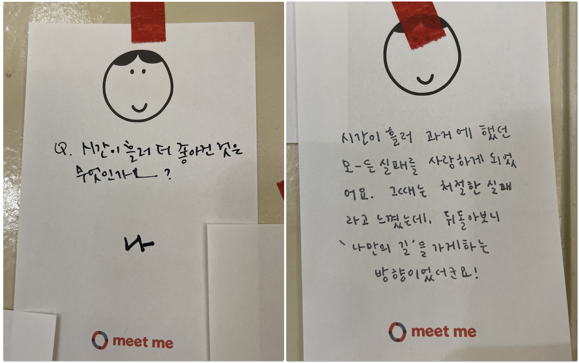 전시를 관람하고 나서는 1층 선물의 집을 구경했어요. 연말을 맞이해서 선물하고 싶은 아이템들이 많아서 이것저것 쇼핑을 하고 구석구석 둘러보는데, 마음을 울리는 쪽지 두 장을 발견했어요. '시간이 흘러 더 좋아진 것은 무엇인가요?'라는 질문에 '나'라고 대답한 쪽지와, 시간이 흘러 과거에 했던 모든 실패를 사랑하게 되었다는 쪽지였는데요. 어쩌면 밑미레터를 쓰는 가장 중요한 이유 중 하나도 우리가 삶에서 이런 순간을 만날 수 있도록 조금이라도 돕기 위해서가 아닐까? 하는 생각이 들었죠. 그래서 오늘 밑미레터는 아래 두 쪽지에서 영감을 받아서, 불완전한 나를 사랑하는 법에 관한 이야기를 써보려 해요. 그럼 오늘 밑미레터를 시작해 볼까요? |
