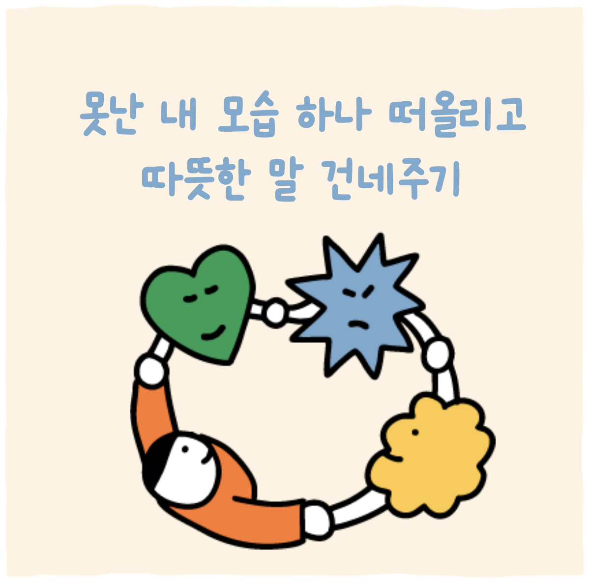 이번 주에는 내 안의 별로인 모습 하나를 떠올려봐요. 질투심, 게으름, 비겁함, 이기심... 무엇이든 좋아요. 그리고 그 모습을 친구에게 하듯 따뜻하게 대해주세요. "너 지금 질투하고 있구나. 그럴 수 있어, 인간이니까." "너 지금 도망치고 싶구나. 괜찮아, 무서우면 그럴 수 있어." 못난 나를 판단하거나 고치려 하지 말고, 그냥 따뜻하게 안아주는 연습을 해봐요. 불완전한 나를 인정하고 받아들이는 것이 불완전한 나를 사랑하는 첫걸음이 되어 줄 거예요.