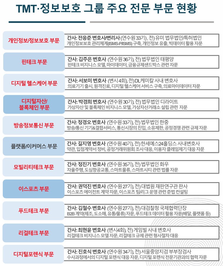 - 린 TMT.정보보호 그룹의 총괄로서, 혁신ICT기업들의 규제자문, 분쟁해결에 진력