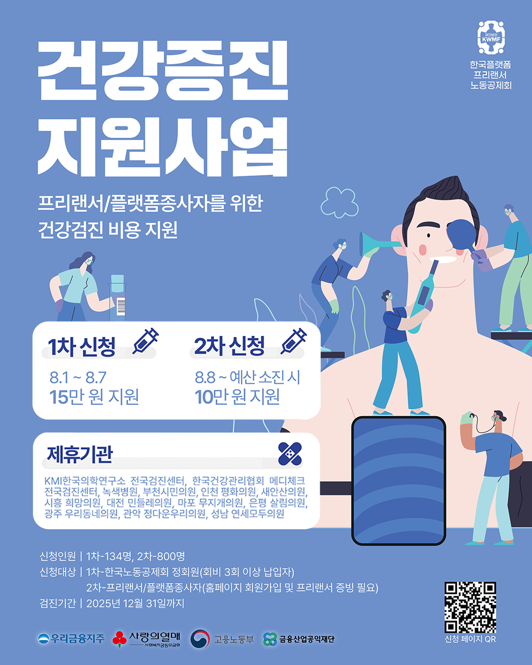 📣 불규칙한 노동환경 속 프리랜서와 플랫폼노동자에게, 건강검진은 필수입니다. 일에 치이고 삶에 쫓기다 보면 건강은 쉽게 뒷전으로 밀려납니다. 정규직 노동자는 회사가 정기검진을 지원하지만, 프리랜서와 플랫폼노동자는 스스로 챙기지 않으면 놓치기 쉽습니다.