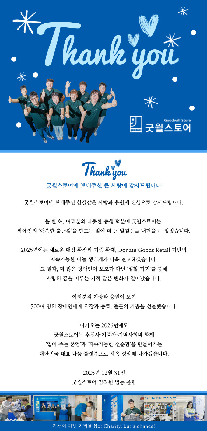 이번 일일직원 체험을 시작으로 윤형빈님은 굿윌스토어와 함께 이 의미 있는 선순환을 더 많은 사람들에게 전해갈 예정입니다. 여러분의 작은 관심과 실천이 누군가의 일자리가 되고, 더 나은 사회로 이어집니다! |