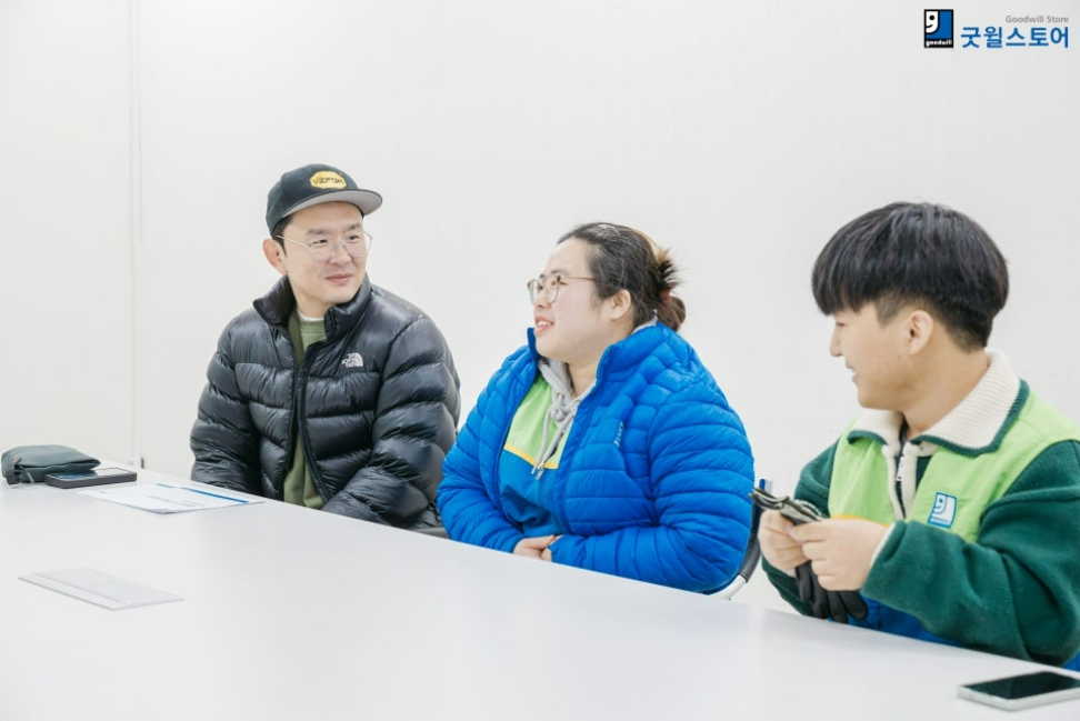 이번 체험에서 윤형빈 님에게는 특별한 파트너 직원이 함께했습니다. 오전 작업장에서는 이혜민 직원이, 오후 매장에서는 송하협 직원이 각각 사수 역할을 맡았어요. 처음이라 서로 어색했지만, 인사를 나누며 오늘 하루 잘 해내겠다는 의지를 다졌습니다. 두 분 모두 굿윌스토어에서 오랜 시간 근무한 에이스 직원이에요✨ 오늘은 선배의 면모를 제대로 보여드릴 예정입니다! |