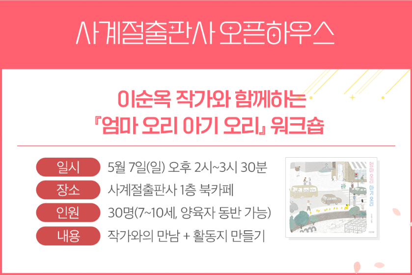 🦆 어린이날을 맞이하여 이순옥 작가님과 만나고 활동지도 함께 만들어 보는 시간을 준비했습니다. 사계절출판사에서 열리는 『엄마 오리 아기 오리』 오프라인 워크숍에 참여하고 싶은 어린이 독자님들의 참여를 기다리고 있어요! 작가님의 책을 가지고 행사에 참여하면, 귀여운 사인도 받을 수 있답니다:) 5월 4일(목)까지 늦지 않게 신청해 주세요! |