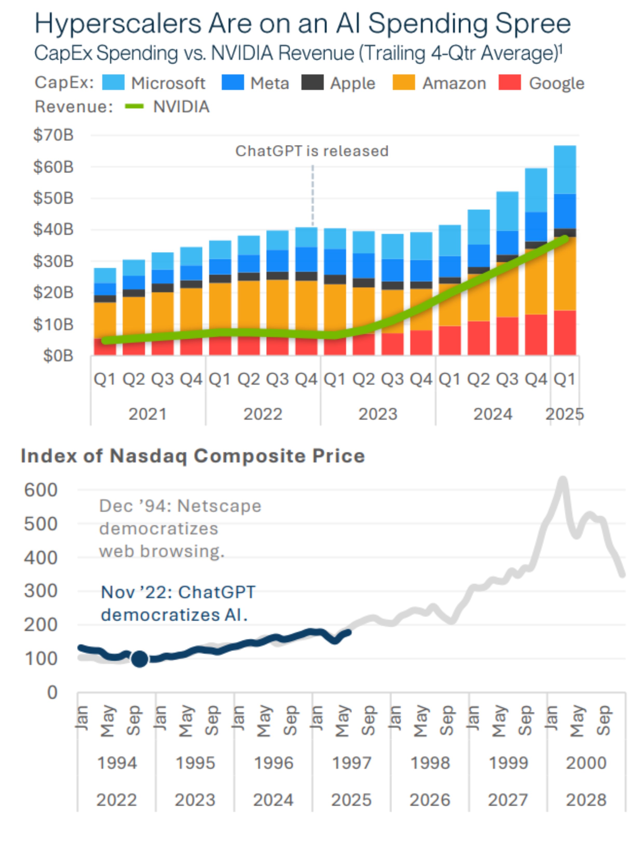 (위) 주요 빅테크 기업의 설비투자(CapEx) 지출과 엔비디아 매출을 비교한 그래프. 2022년 말 챗GPT 출시 이후 빅테크의 AI 인프라 지출이 급증했고, 엔비디아 매출도 가파르게 상승했다. (아래) 닷컴버블 시기(1994~2000)와 생성형 AI 시대(2022~현재)의 나스닥 지수 흐름. 1994년 넷스케이프 웹브라우저 출시로 대중적 인터넷 시대가 열렸을 때와, 2022년 말 챗GPT 출시로 AI가 대중화된 이후 흐름이 유사하게 전개되고 있다. 2024~2025는 닷컴버블 당시 1998~1999년에 해당하는 중반 국면으로 보인다.