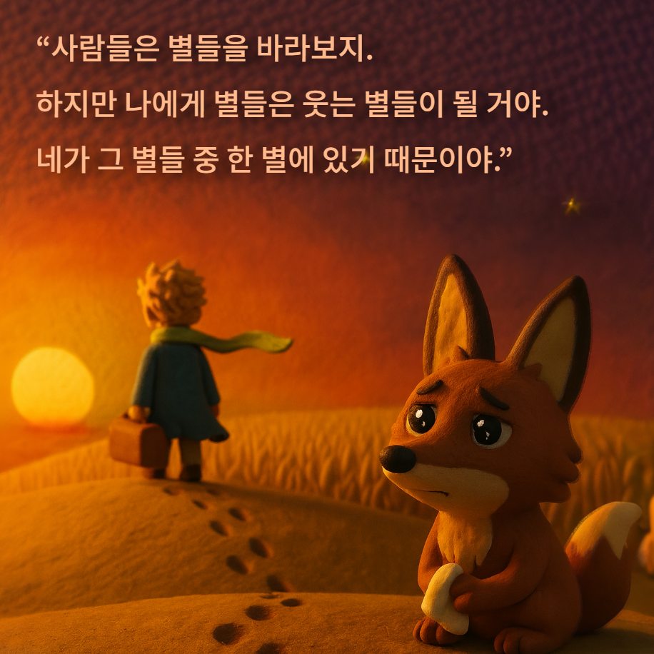 어린 왕자와 여우의 이별: 어린 왕자는 “사람들에게 별은 단순한 점일 뿐이지만, 나에게는 웃는 별이 될 것”이라고 말한다. 어떤 대상을 직접 바라보지 않아도, 그 대상과 공유한 기억이 이후의 모든 지각을 바꾸어 놓는다는 뜻이다.