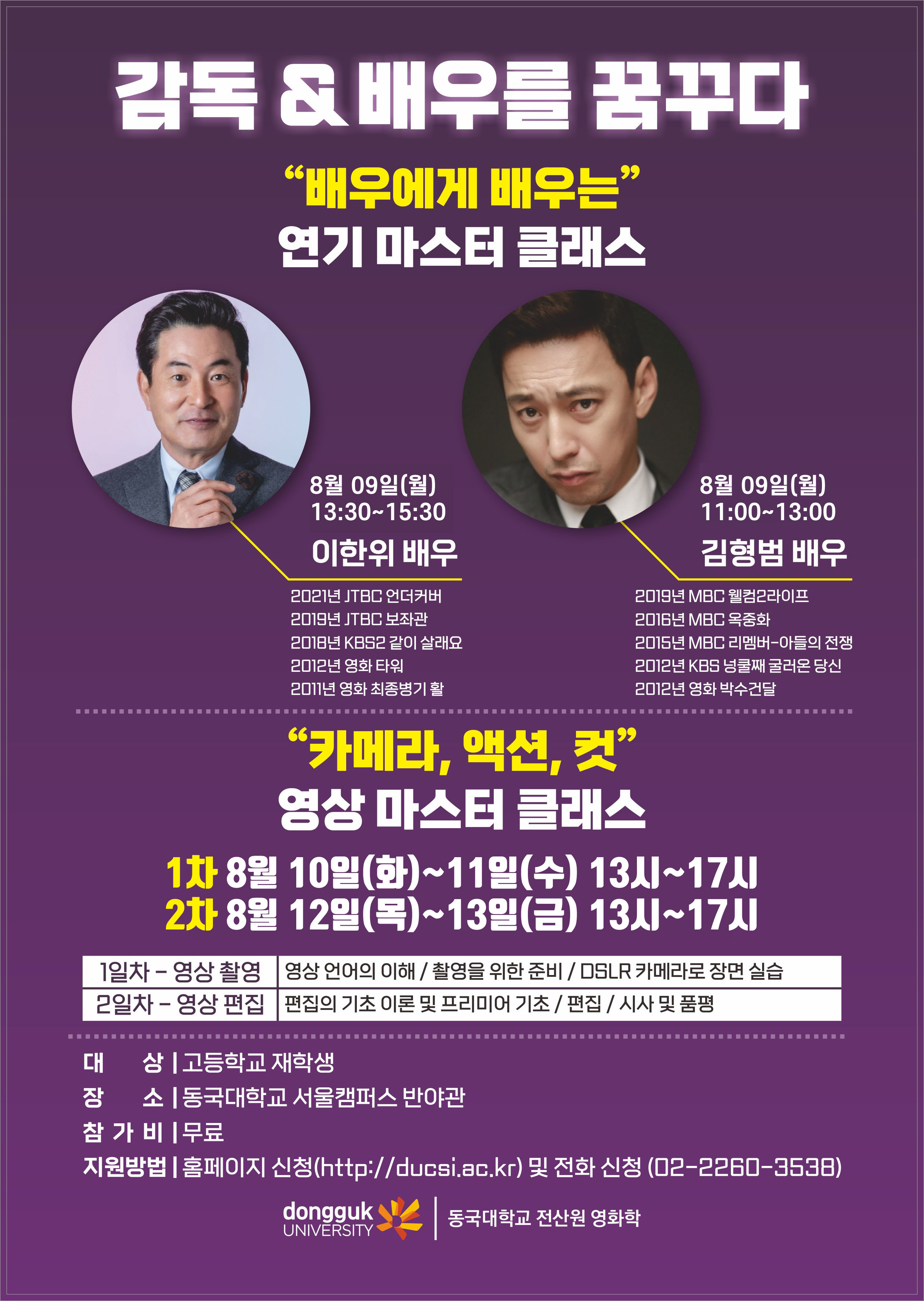 동국대학교 전산원에서 주최하는 연기 & 영상 마스터 클래스가 열립니다! 영화인이라면 얼굴 보고 바로 알아볼 이한위 배우와 김형범 배우의 특강을 들을 기회! 혹시나 배우를 꿈꾸고 있다면 더할 나위 없이 좋은 기회겠죠? 만약 영화 & 드라마 감독을 꿈꾸고 있다고요? 그렇다면 이 기회를 통해 영상 촬영부터 영상 편집까지 종합적으로 배울 수 있답니다. 심지어 참가비도 무료예요. 다만 고등학생만 수업을 들을 수 있다는 거! 😄 8월에 열리는 이 수업들은 지금 동국대학교 전산원 홈페이지에서 신청할 수 있어요! 이번 여름 방학, 꿈을 펼칠 기회를 잡아 보는 거 어떨까요?