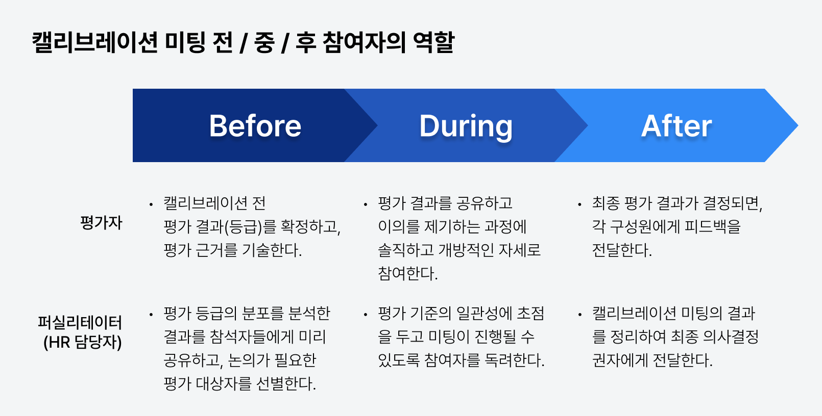 평가자/부서/직무/기대수준별로 일관된 성과평가가 이뤄질 수 있도록 '공통된 인식'을 도출하는 것이 캘리브레이션 미팅의 목적입니다. 시시비비를 가리기 위한 목적이 아니라 같은 등급을 받은 피평가자의 행동과 그 행동의 결과에서 공통점을 찾아내고, 누구나 어디서든 같은 기준으로 일관된 평가를 받을 수 있도록 하는 것이 이 미팅의 목적임을 잊지 말아야 합니다. |