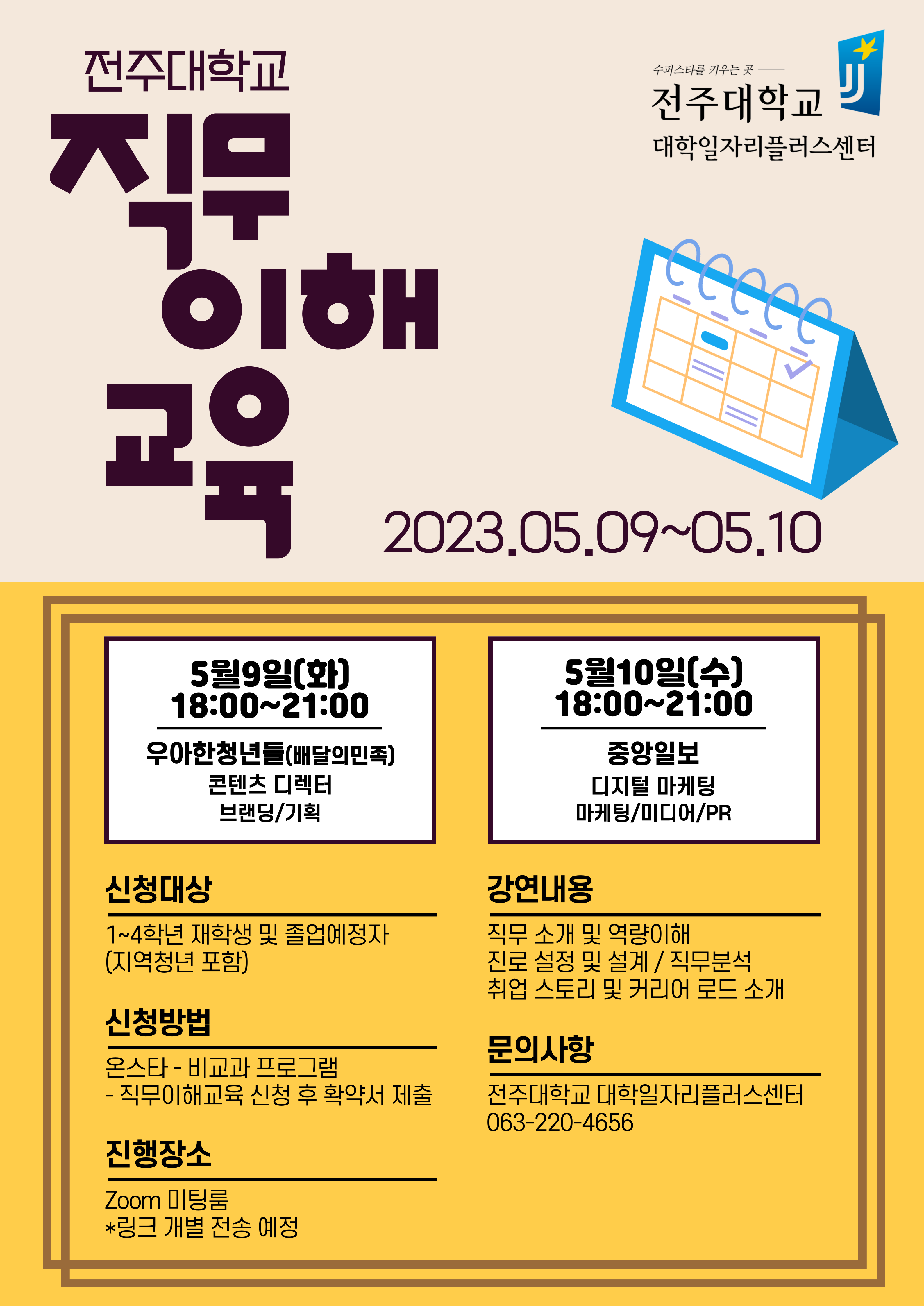 전주대학교 “2023 온라인 직무이해 교육”은 2023년 5월 9일 화요일부터 5월 10일 수요일까지 온라인에서 진행된 직무 맞춤형 집중탐색 프로그램이에요!