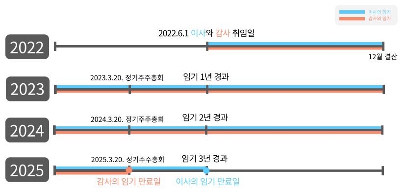 2022년 6월 1일에 이사님과 감사님이 같은 날에 취임하셨네요. 하지만 임기가 3년 째 되는 해인 2025년을 보면 이사님과 감사님의 임기 만료일이 다른 것을 알 수 있습니다. 임기가 2025년 6월 1일까지인 이사님과 달리, 감사님은 취임 후 3년 이내의 최종 결산기에 관한 정기주주총회일인 3월 20일에 임기가 만료됩니다.