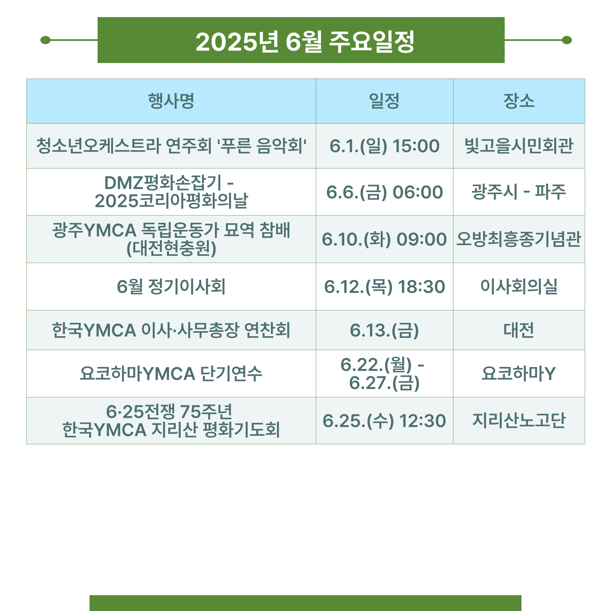 한국YMCA 지리산평화순례를 6월 25일(수) 노고단 주차장에서, 유지, 전문지도력 워크숍을 10월 중 1박 2일로 제주도에서 개최할 것을 결의하였습니다.
