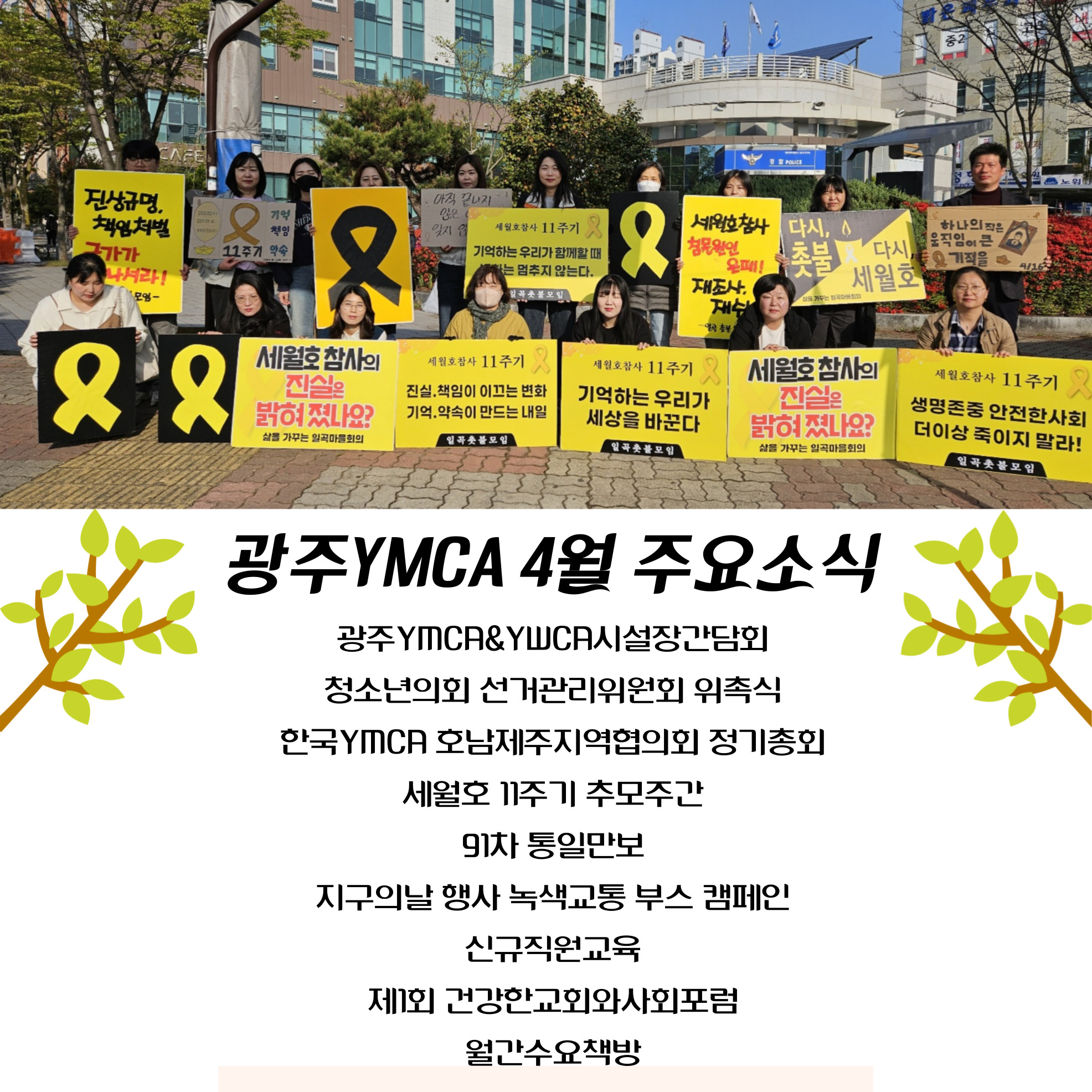전시와 더불어 시민들이 직접 추모 문구를 남길 수 있는 ‘기억 문구 적기 캠페인’이 함께 운영되었고, YMCA 경건회에서는 세월호 희생자들을 위한 추모 예배가 진행되었습니다. 홈페이지와 내부 안내를 통해 추모 주간을 함께 알리며, 전 구성원이 기억에 동참할 수 있도록 하였습니다. |