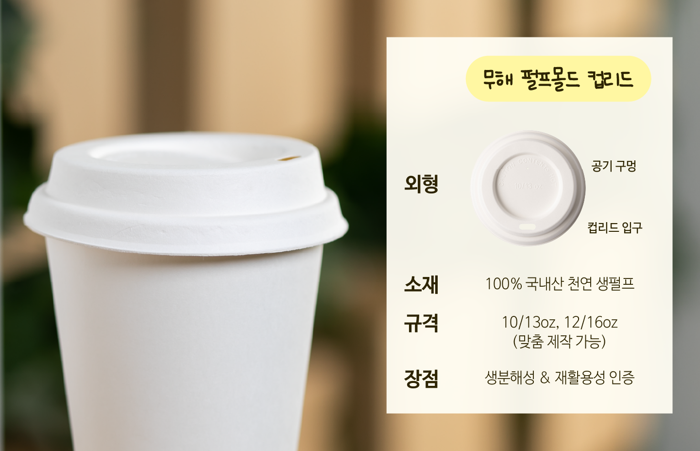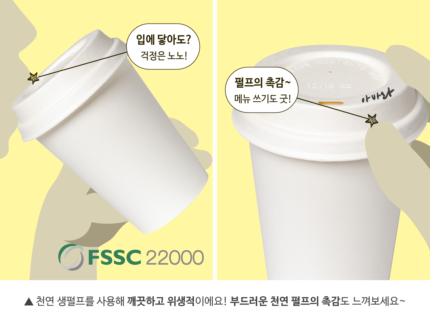 음료를 마실 때 직접 입을 대는 만큼 '위생'이 중요한 컵리드! 뜨거운 음료를 마실 때는 열기에 바로 노출돼 식품 안전성 역시 중요합니다. 무해 펄프몰드 컵리드는 100% 국내산 천연 생펄프가 밀폐된 이송관을 거쳐 생산돼, 외부 오염의 혼입 걱정 없이 만들어져요. 업계에서 유일하게 식품안전시스템인증(FSSC 22000)을 받았다니, 어떤 음료든 안심하고 즐길 수 있겠죠? 참, 부드러운 천연 펄프의 촉감도 매력적인데요. 새하얗고 보드라운 표면은 메뉴 이름을 헷갈리지 않도록 적어놓기에 딱입니다. |