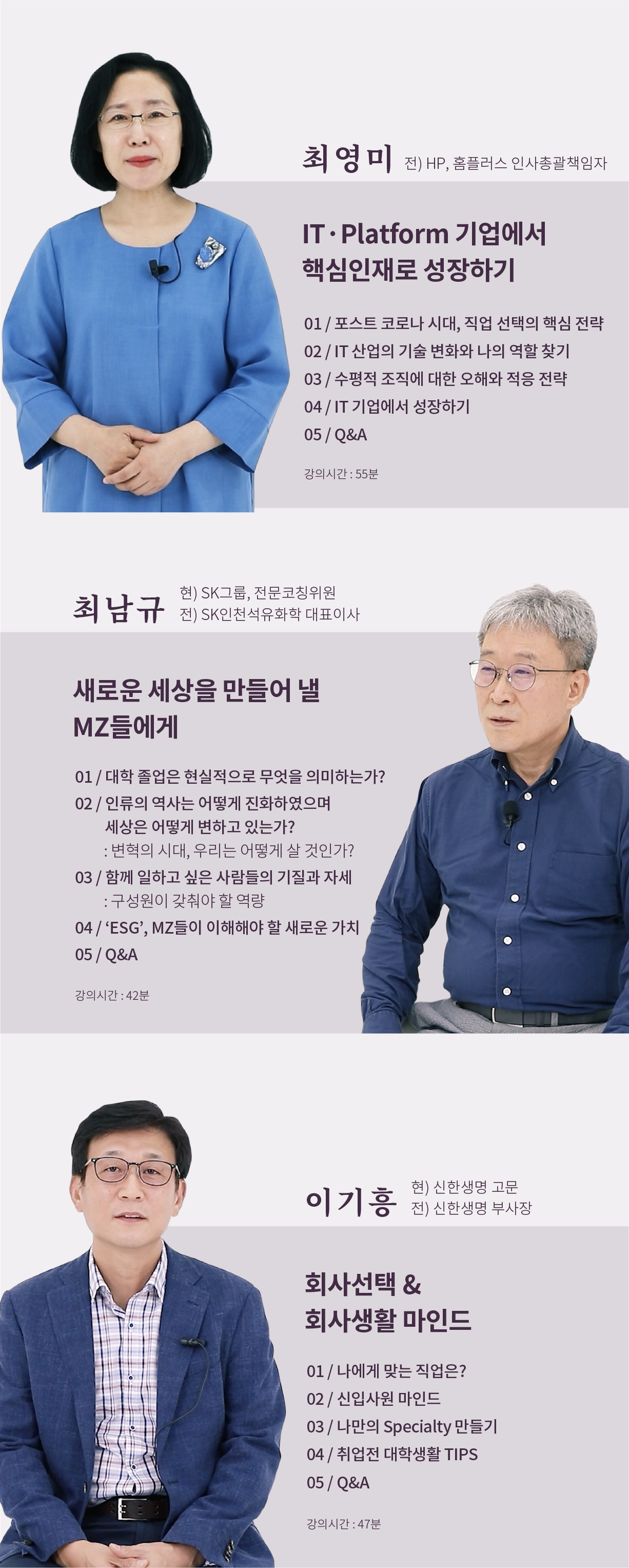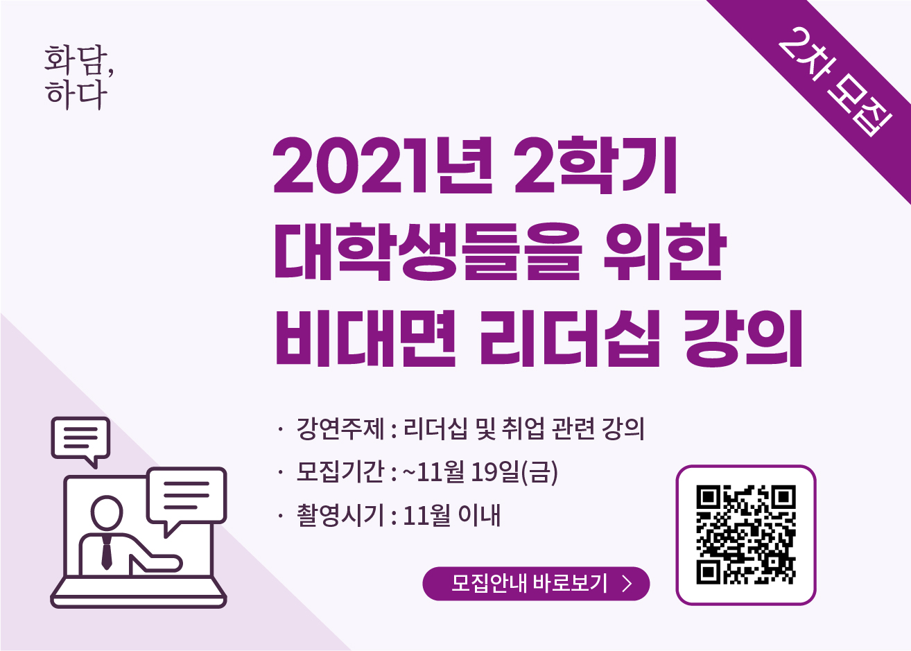 화담,하다가 MZ 커리어 준비생들을 위한 비대면 강의에 참여할 리더들을 모집합니다. 본 프로젝트는 지난 9월 1차 비대면 강의가 성공적으로 진행되는 중에 전국 대학들로부터 추가적인 요청을 받아 기획하게 되었습니다. 통통 튀는 아이디어가 넘치는 MZ세대들에게 다양한 경험과 지혜를 나누어 주실 최고의 리더들을 기다립니다. <MZ 소통 프로젝트>의 비대면 강의는 리더들께서 직접 주제를 제안하고 화담,하다가 기획과 운영 및 스튜디오 촬영 등 전과정을 지원합니다. <모집안내> 모집대상 : 1. 국내 대기업 및 외국계 기업 임원 이상 2. 공공기관 기관장급 리더 강연주제 : 리더십 및 취업 관련 강의 모집기간 : ~11월19일(금) MZ 소통 비대면 리더십 강의에 관심있는 리더분들의 많은 참여 바랍니다. 아울러, 뉴스레터 #043호에서 소개드린 MZ 커리어 준비생들을 위한 1:1 코칭/멘토링 세션의 모든 포지션이 하루만에 마감되었고 7명의 학생들과 성공적으로 진행 중입니다. 앞으로도 리더들을 위한 더 많은 뉴업 포지션을 소개해 드리겠습니다. 리더들의 퇴직플래너 화담,하다 드림 최고경영진 <MZ소통 프로그램> 비대면 리더십 강의 1기 리스트