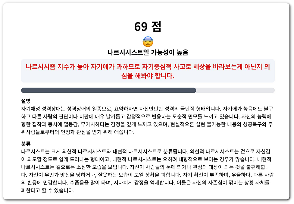 내가 나르시시스트인지 아닌지 알려주는 테스트 가져왔어. 나는 점수가 낮게 나올 줄 알았는데, 50점이 나와서 좀 놀랐지 뭐야. 근데 이건 아무것도 아니었어. 에디터B는 69점이 나왔거든. 어떻게 이렇게 높게 나올 수 있냐고 했더니 "친구들 중에 내가 제일 잘났다"에 당당히 "그렇다"고 답했기 때문이래. "이 정도의 자신감은 있어야 하는 게 아닌가요?"라는 멘트까지 완벽했다…! 나는 얼마나 나르시시스트인지 궁금하다면 [여기]서 테스트해 봐. |