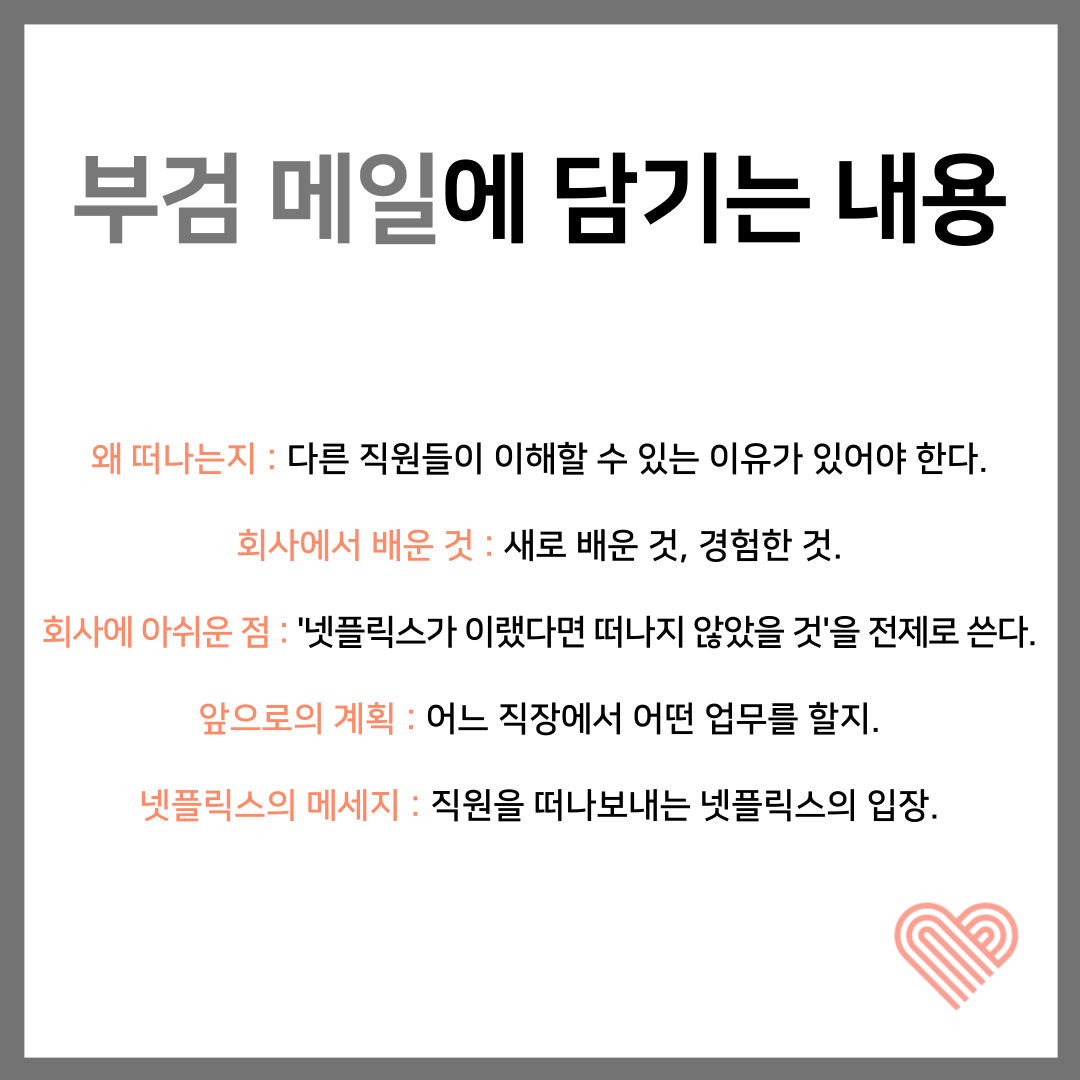 1. 떠나는 이유는 '넷플릭스 10가지 가치'에 입각해 작성 - 떠나는 이유는 자신이 회사가 추구하는 가치와 무엇이 맞지 않았는지 등을 고려해 작성해야합니다. 넷플릭스의 10가지 가치는 결정, 소통, 호기심, 용기, 열정, 이타심, 혁신, 표용력, 정직, 임팩트 등 입니다 😊