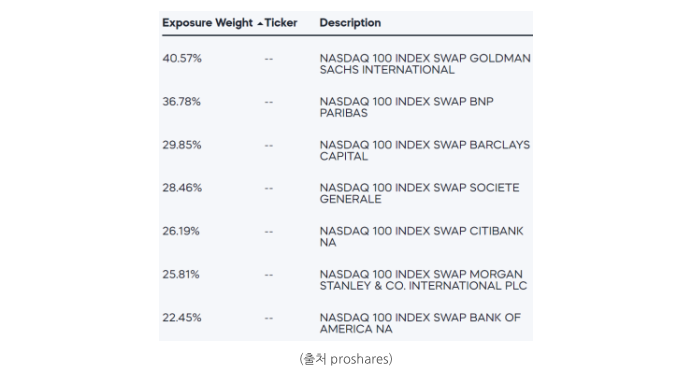 즉 TQQQ가 자체적으로 3배 레버리지를 일으키는 것이 아니라 TQQQ를 운용하는 ProShares 운용사가 여러 투자회사들과 계약하여 현물, 선물 비중을 분배한 후 종합하면 3배의 수익을 거둘 수 있도록 셋팅된 것입니다. |
