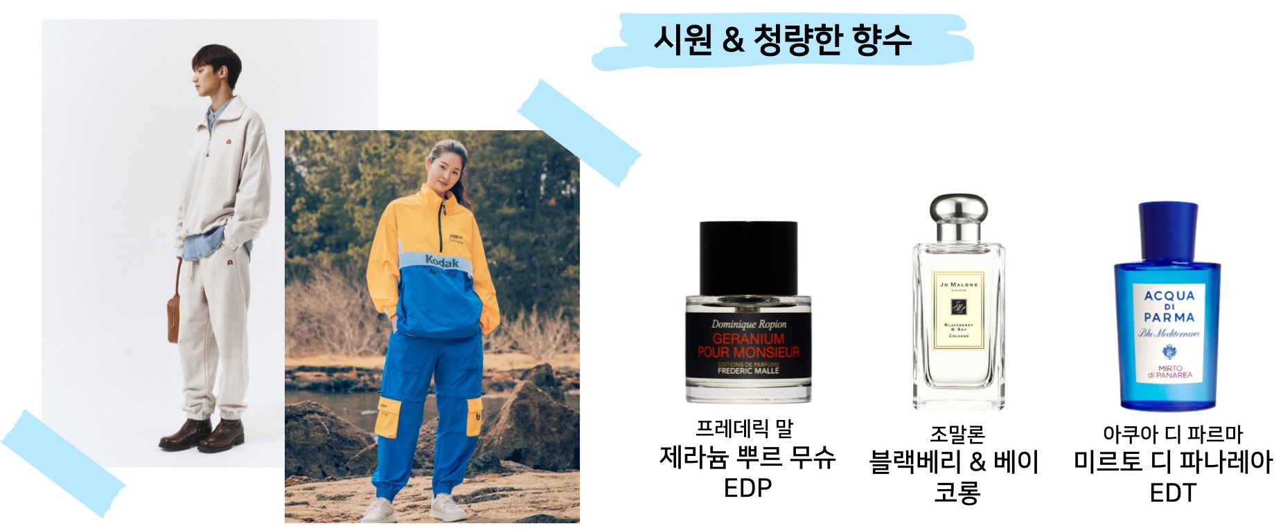 스포티 룩🏃: 편하게 트레이닝복과 점퍼를 즐겨 입는 스타일, 흔히 '원마일 웨어'라고 하죠! 자유롭고 활기찬 분들이 주로 입으실 것 같아요. 그래서 시원하고 청량한 향수를 뿌리면 에너제틱한 분위기가 더 강조될 것 같습니다!