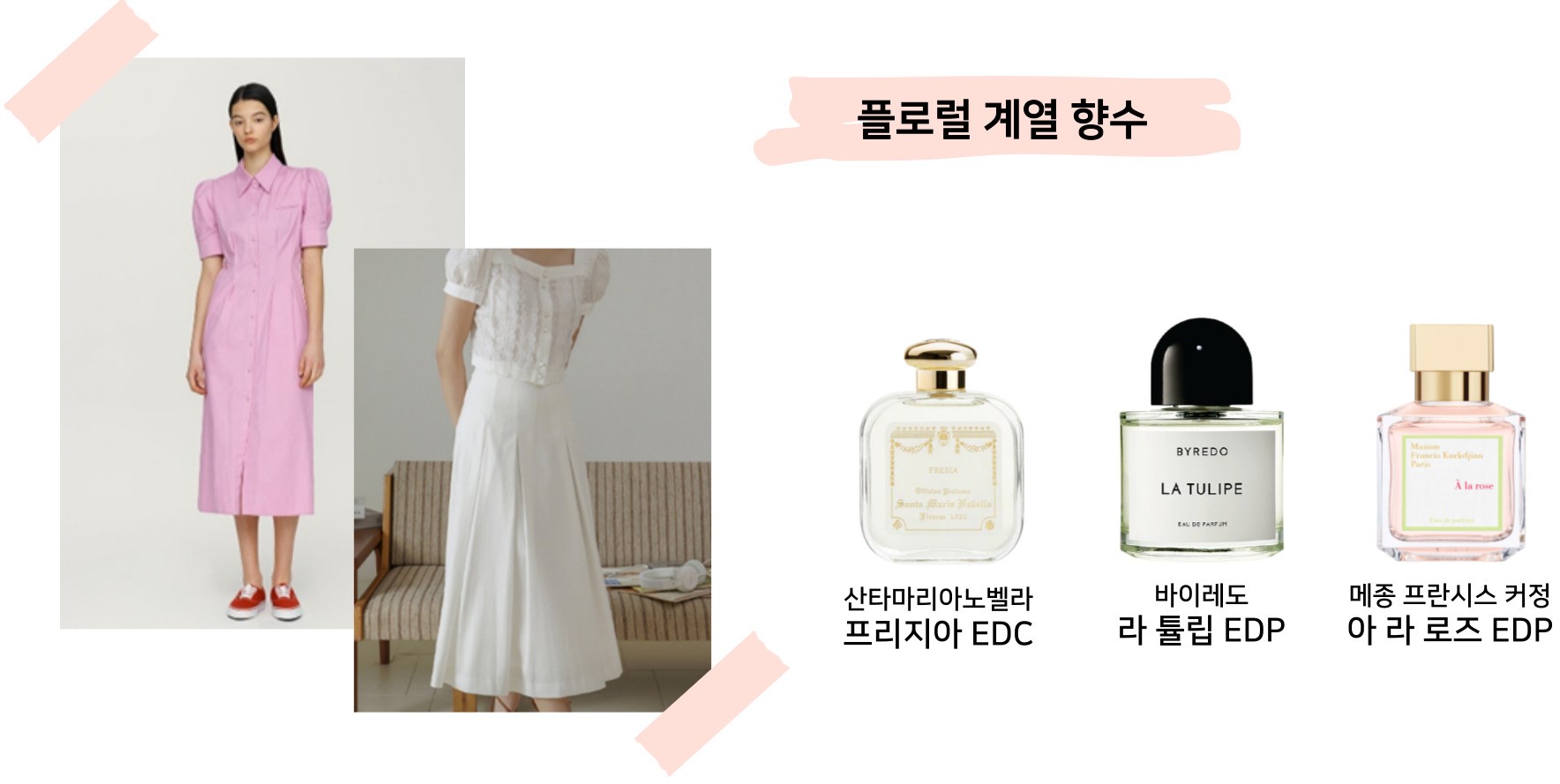 로맨틱 룩👸: 원피스와 치마, 그리고 프릴 디테일이 있는 게 특징이에요. 깨끗한 하얀색이나 연한 하늘색이 연상되는데요! 청순하고 화사한 분위기를 연출할 수 있는 촉촉한 플로럴 계열의 향수가 잘 어울릴 것 같아요.