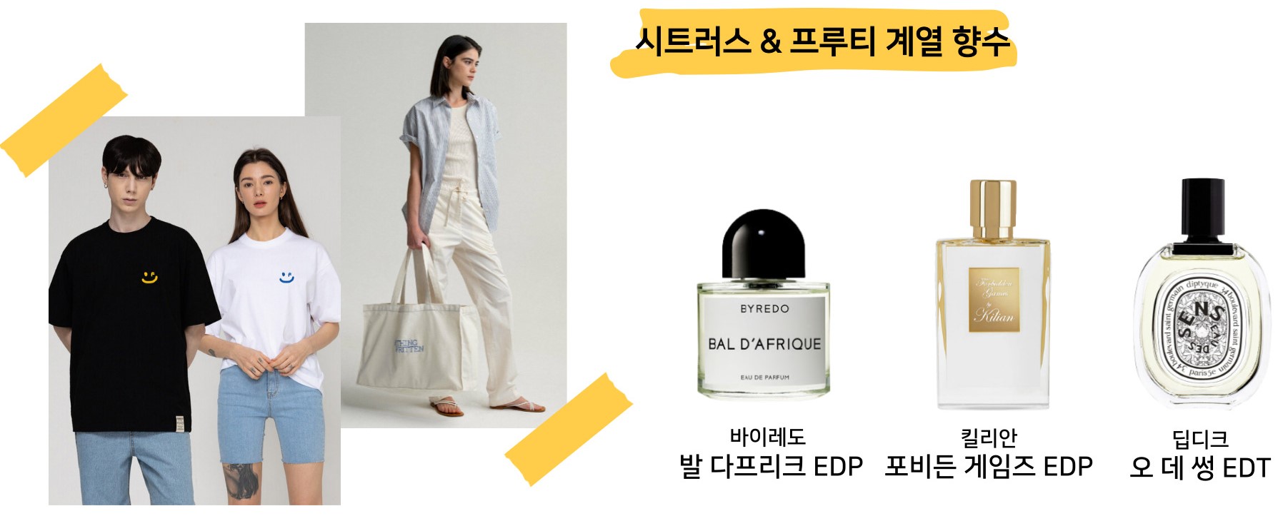 캐주얼 룩🙋: 심플하게 셔츠, 티셔츠에 데님이나 슬랙스를 매치해 입는, 흔히 '꾸안꾸' 패션이라고 말하죠. 전체적으로 튀지 않는 스타일이지만 약간의 센스를 곁들인 룩이에요. 시트러스나 프루티 계열의 향수로 룩에 포인트를 주면 어떨까요?
