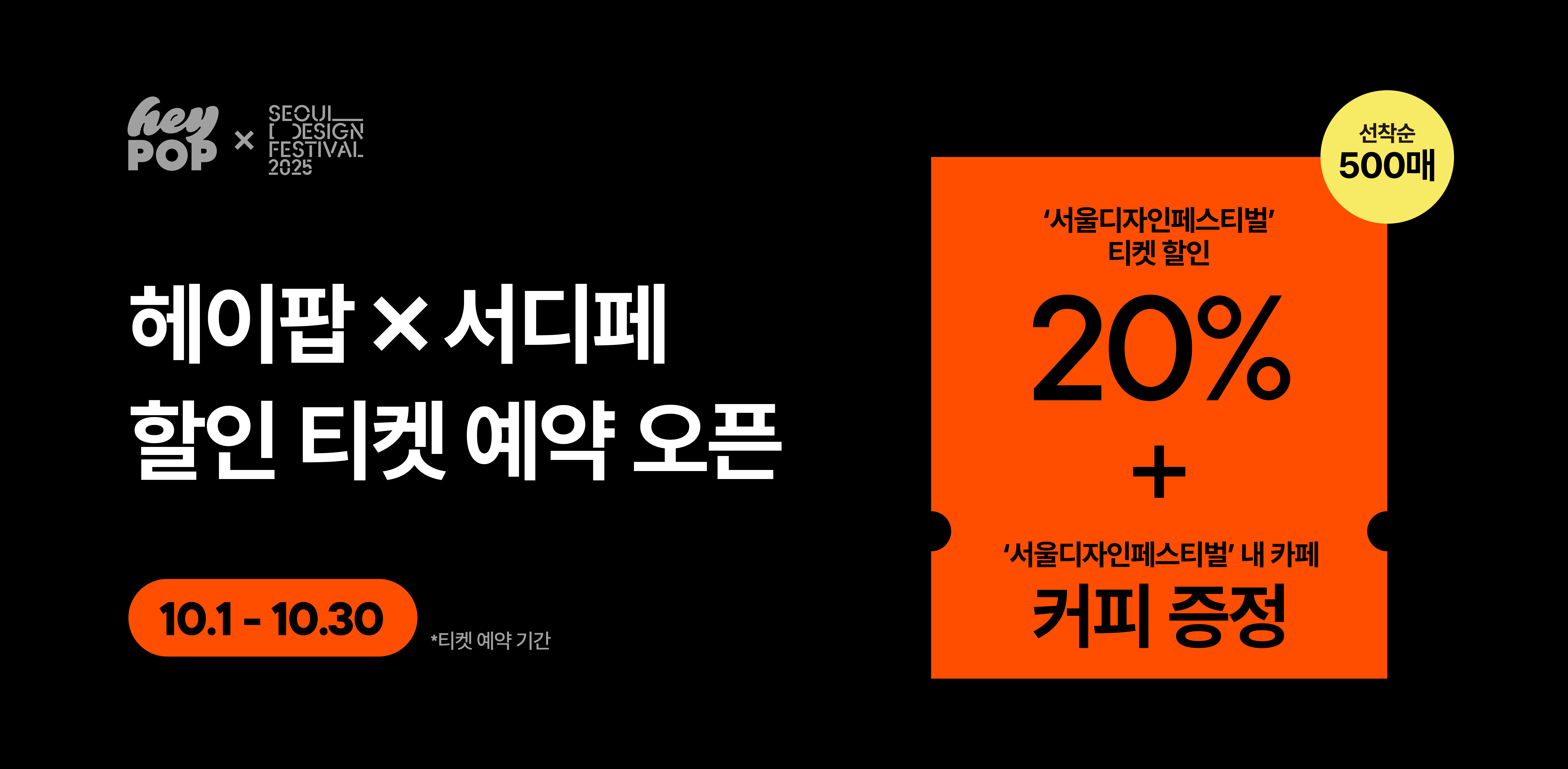 게다가 도시에 숨겨진 디자인 스폿을 발견하는 ‘2025 SEOUL DESIGN SPOT’은 헤이팝과 함께 특별한 이벤트를 마련했어요. 디자인 스폿 중 다섯 곳 이상을 방문한 이에게 사은품을 증정하는 ‘스탬프 투어’인데요. 선착순이니 관심 있는 분들은 서두르는 게 좋으실 거예요. 참여 리스트와 자세한 내용은 여기서 확인하세요.