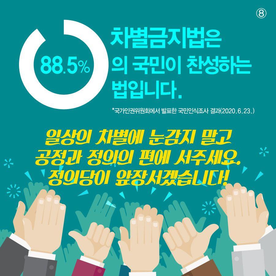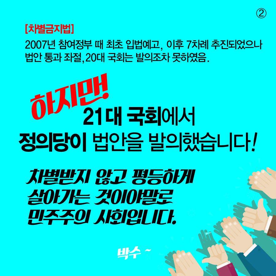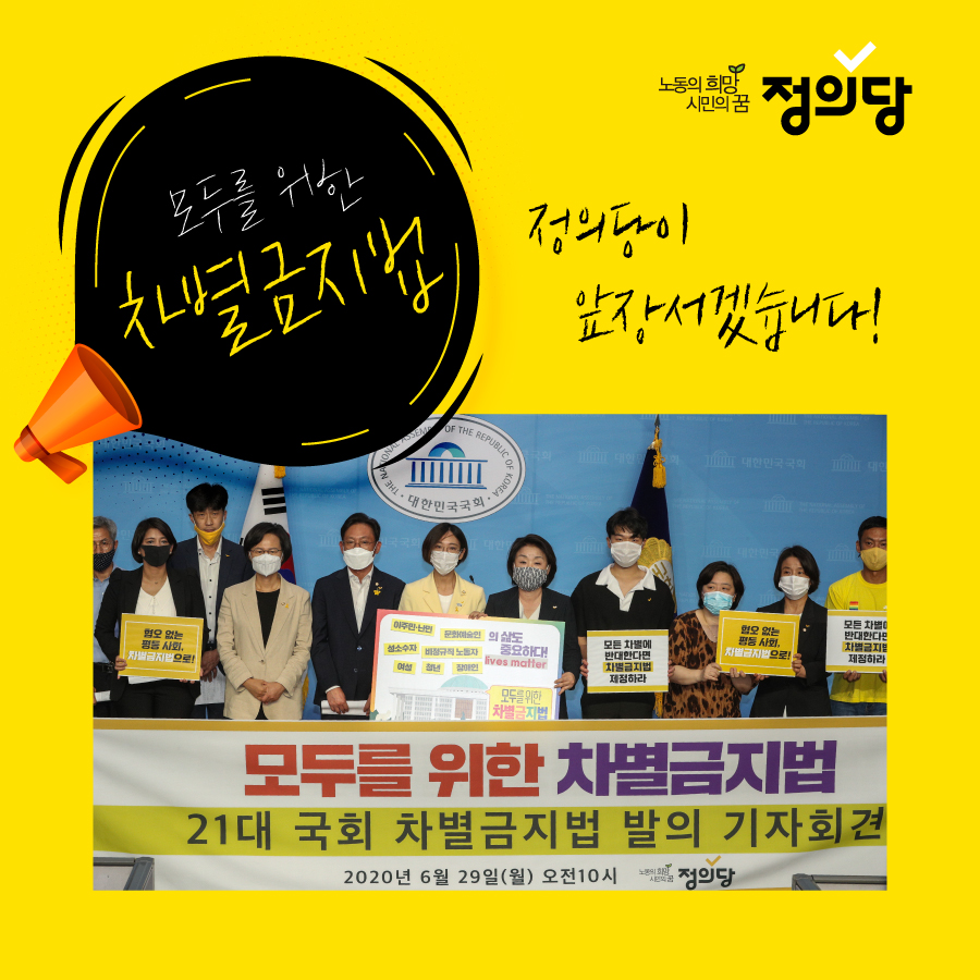 1. 모두를 위한 차별금지법 발의 지난 6월 29일(월) 오전10시, 모두를 위한 차별금지법 발의 기자회견을 진행했습니다. 차별금지법은 우리사회의 차별을 해소하고 평등한 사회를 실현하기 위한 법입니다. 정의당은 누구도 배제되지 않고, 차별받지 않으며, 혐오의 대상이 되지 않는 공동체를 지향하며, 21대 국회가 차별금지법 제정으로 그 출발이 되기를 기대합니다.