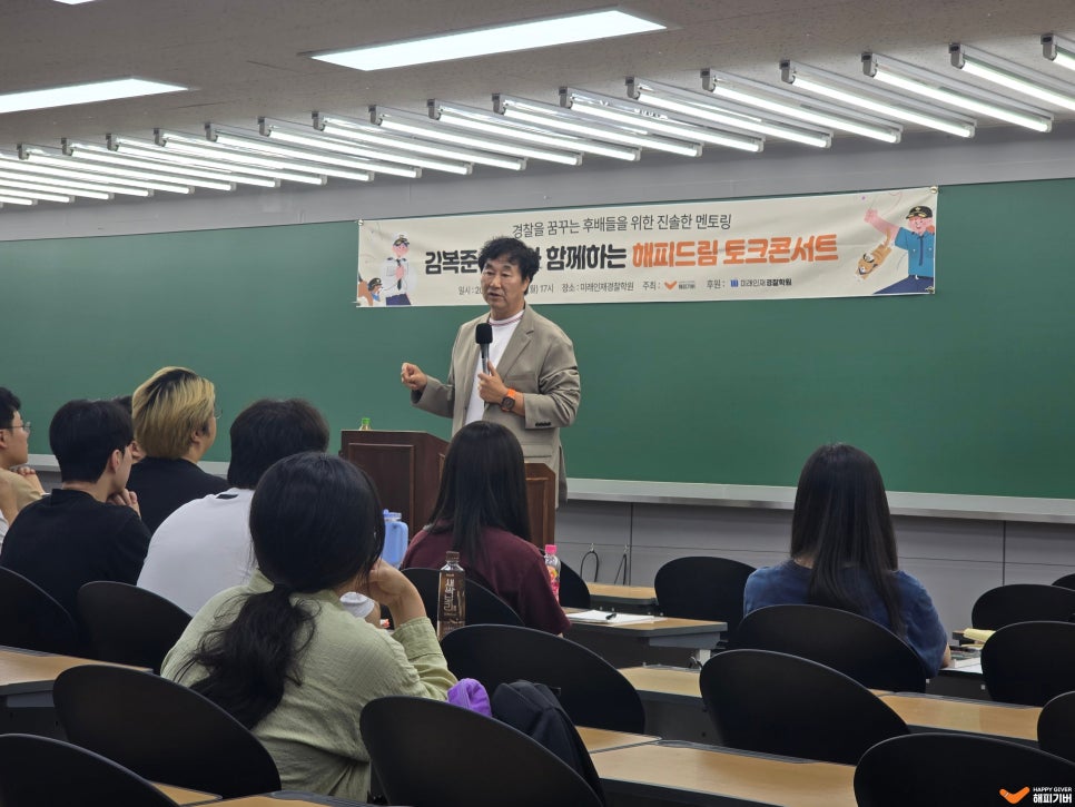 지난 6월, 서울 노량진에 위치한 경찰학원에서 해피기버 홍보대사 김복준 교수님과 함께하는 '해피드림 토크콘서트'가 진행되었습니다. 이번 토크콘서트에는 경찰을 꿈꾸는 약 50여 명의 경찰 지망생 분들이 참여해주었는데요! 국민의 안전과 질서를 책임질 인재들의 뜨거운 열정과 반짝거리는 눈빛이 인상 깊었습니다. 김복준 교수님의 재능기부로 진행된 이번 토크콘서트는 단순한 특강이 아닌, 진심 어린 격려와 따뜻한 응원이 깃든 시간이 되었다고 생각되는데요. 앞으로도 해피기버는 미래를 향한 청년들의 발걸음에 힘을 더하며 함께하겠습니다 :) |