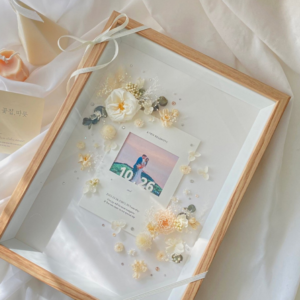 평범한 청첩장이 오랫동안 기념할 수 있는 작품으로 바뀌었어요. 결혼 후에도 기억 남을 선물로 이만한 것이 또 있을까요? 머리맡에 두고 매일 볼 때마다 행복한 기억이 떠오를 거예요. (ⓒ꽃집,따뜻 작가님)