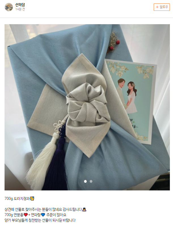 아직 결혼식은 멀었지만 떨리는 첫 만남, 상견례를 앞두신 분도 있을 텐데요. 양가 부모님께 인사드리면서 준비된 선물을 건네드리며, 편한 대화 자리를 만들어보는 건 어떨까요? 고급스러운 보자기 포장에 건강까지 담은 도라지 정과를 만드는 선하담 작가님의 피드에서 상견례로 어떤 주문이 많은지 살짝 힌트를 받아봐요.