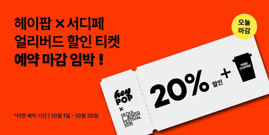 헤이디만을 위한 SDF 티켓을 소개할게요. 흑유재와 함께 준비한 콜드브루 한 캔이 포함된, 오직 헤이팝에서만 만날 수 있는 구성이에요. 할인된 가격으로 티켓을 구매할 수 있는 예약 날짜가 10월 30일, 오늘까지니 놓치지 마세요! |