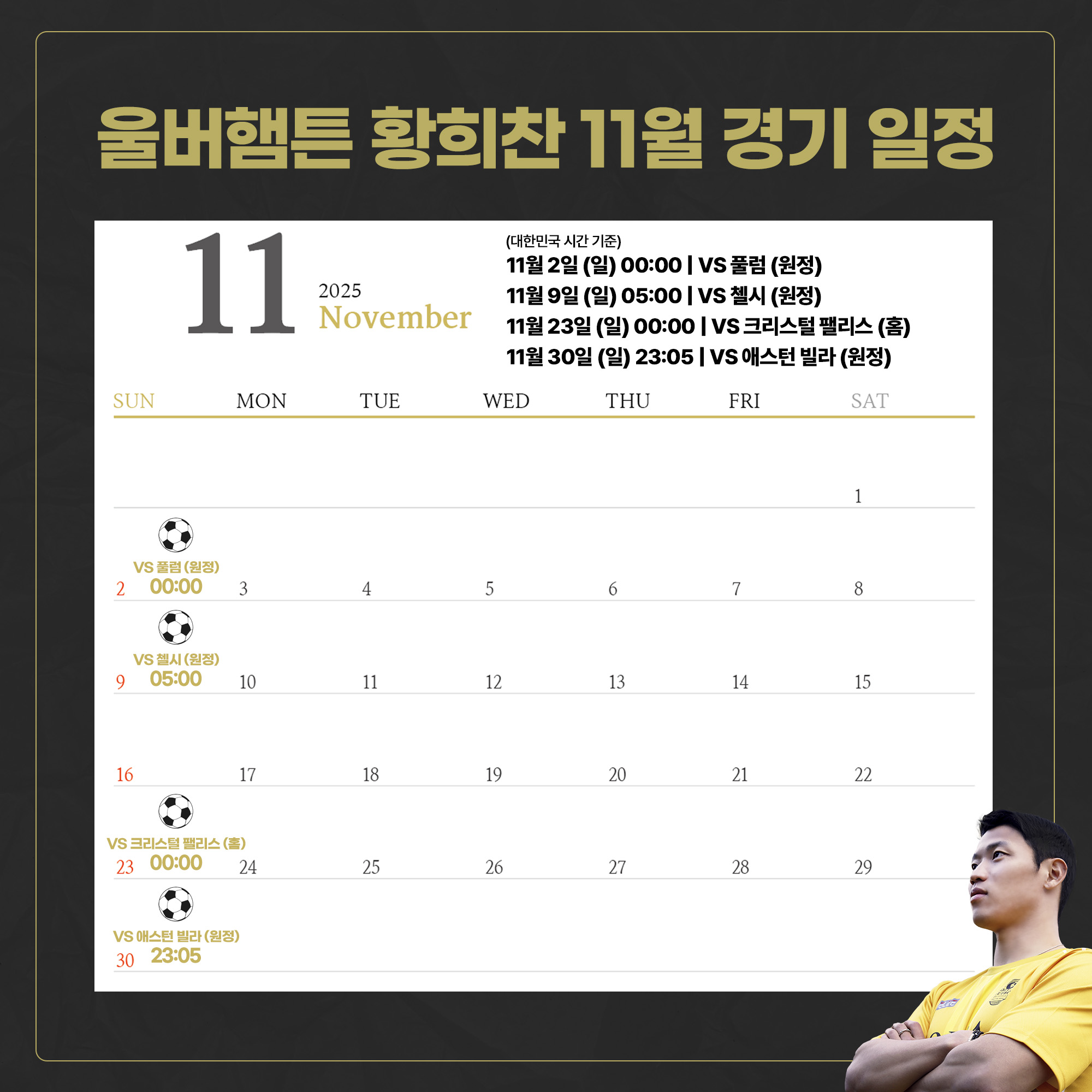 [7] 황희찬 선수와 함께 뛰는 11월, 울버햄튼 경기 일정을 안내합니다. |