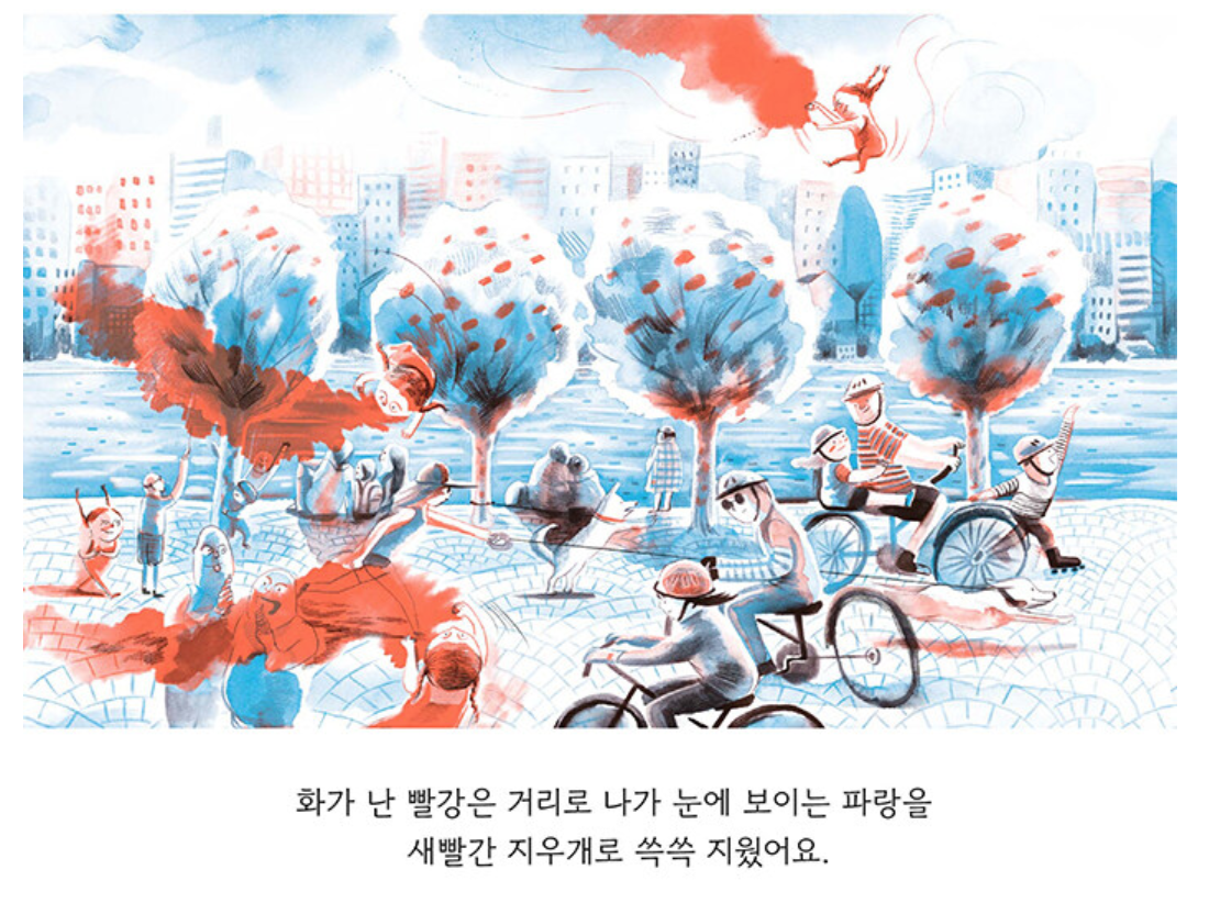 처음에 빨강은 자기 자신이 질투한다는 걸 인정하지 않았어요. 그래서 질투에 사로잡혀 파랑의 인기를 없애려다가, 자신이 원하는 진정한 인기와 멀어지거든요. 먼저 우리 안에 있는 질투라는 감정을 인식하고 인정하는 게 중요해요. 질투가 나서 남을 해코지한다는 게 나쁜 거지, 질투를 느끼는 건 자연스러운 거잖아요.