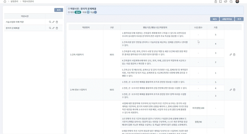 2021년 8월 Vol.04 서비스 업데이트 안내 👍 역량사전을 통해 역량항목을 관리 할 수 있는 기능이 추가 되었습니다. 이 기능을 통하여 공통된 직급/직위/직무의 대상자들에게 적용되는 역량 항목을 구성 할 수 있게 되었습니다.