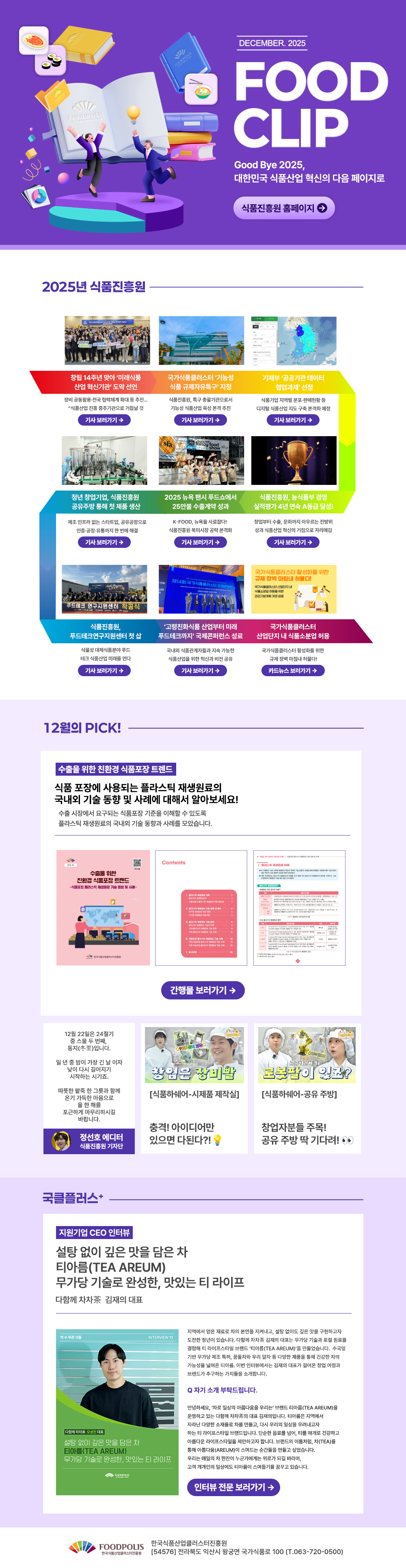 식품진흥원 홈페이지 창립 14주년 맞아 ‘미래식품산업 혁신기관’ 도약 선언 국가식품클러스터 ‘기능성식품 규제자유특구’ 지정 '기재부 ‘공공기관 데이터 협업과제’ 선정 식품진흥원, 농식품부 경영실적평가 4년 연속 A등급 달성! 2025 뉴욕 팬시 푸드쇼에서 25만불 수출계약 성과 청년 창업기업, 식품진흥원 공유주방 통해 첫 제품 생산 식품진흥원, 푸드테크연구지원센터 첫 삽 ‘고령친화식품 산업부터 미래 푸드테크까지’ 국제콘퍼런스 성료 국가식품클러스터 산업단지 내 식품소분업 허용 수출을 위한 친환경 식품포장 트렌드 수출을 위한 친환경 식품포장 트렌드 충격! 아이디어만 있으면 다된다?! 창업자분들 주목! 공유 주방 딱 기다려! 지원기업 CEO 인터뷰 지원기업 CEO 인터뷰 식품진흥원 홈페이지