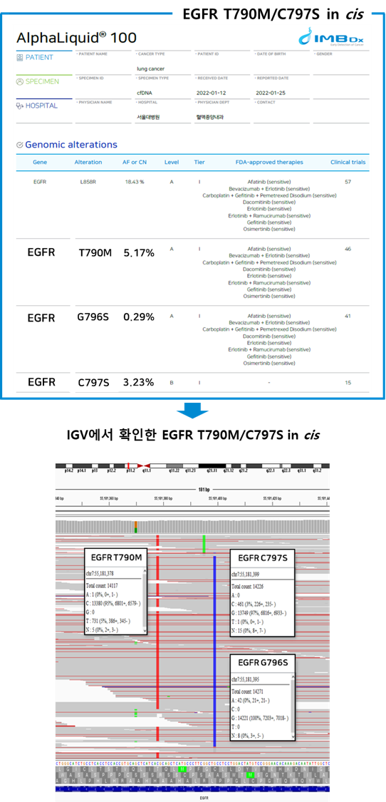 AlphaLiquidยฎ100์ ์ฌ์ฉํ์ฌ NSCLC์์ ํํ๊ฒ ๋ฐ๊ฒฌ๋๋ฉฐ ๊ธฐ์กด ํํ ์๋ฒ๊ณผ ๋น๊ตํ์ฌ TKI (tyrosine kinase inhibitor)๋ก ์น๋ฃํ ๋ PFS (progression-free survival)๊ฐ ๋ ๊ธด ๊ฒ์ผ๋ก ์๋ ค์ง EGFR hot spot ๋ณ์ด์ธ Exon 19 deletion, Exon 20 T790M ๊ทธ๋ฆฌ๊ณ Exon 21 L858R substitution ๋ฑ์ ๊ฒ์ถํ์์ต๋๋ค. ์ด์ ๋ํ์ฌ 3์ธ๋ EGFR TKI์ ์ ํญ์ฑ์ ๊ฐ์ง C797S ๋ณ์ด (T790M ๋๋ L858R๊ณผ cis-allele mutation)๋ฅผ ๊ฒ์ถํ ์ฌ๋ก๋ ์์ด ์๋ ๋ถ์ ๊ฒฐ๊ณผ๋ฅผ ์๊ฐํฉ๋๋ค. |