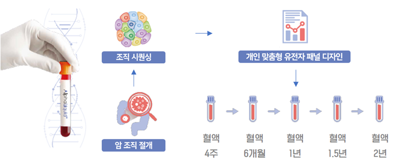 ์์์ ์ ๋๋ ctDNA(circulating tumor DNA)์ ๋ณ์ด๋ฅผ ๋ถ์ํด ์์ ์กฐ๊ธฐ์ ์ง๋จํ๊ณ ์์ ์งํ ์ํ ๋ฐ ์น๋ฃ ํจ๊ณผ๋ฅผ ๋ชจ๋ํฐ๋งํ๋ ๊ฒ์ฌ์