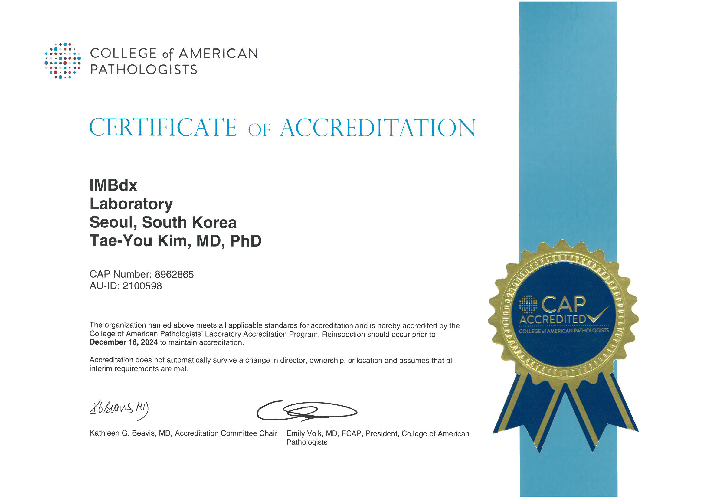 IMBdx๊ฐ ๋ฏธ๊ตญ๋ณ๋ฆฌํํ(CAP, College of American Pathologists) ์ธ์ฆ์ ๋ฐ์์ต๋๋ค!๐