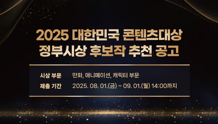 한국콘텐츠진흥원에서 대한민국 콘텐츠 산업 발전에 기여한 콘텐츠를 선정・시상하기 위한「2025년 대한민국 콘텐츠대상(애니메이션)」정부시상을 다음과 같이 공고합니다.