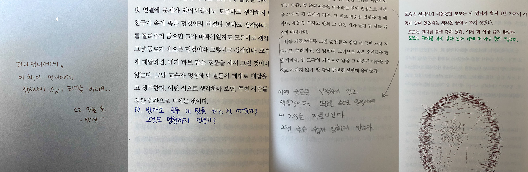사람마다 독서 습관이 다르다. 흔적 없이 깨끗하게 보는 걸 선호하는 사람도 있지만, 나는 마음에 울림이 있고 기억하고 싶은 문장에 밑줄을 치거나 인덱스 탭을 붙이는 등 손때를 묻히며 본다. 내게 책을 주는 친구도 그런 편이다. 그녀가 읽은 책을 빌려보면 중간중간 글에 대한 생각이나 저자에게 던지는 질문을 적어놓은 흔적과 만난다. 그걸 보는 재미도 쏠쏠하다. ‘ㅋㅋㅋㅋㅋ’라고 써놓은 걸 보면서 나도 따라서 킥킥 웃기도 하고 꾹꾹 눌러 쓴 문장을 조용히 소리 내어 읽어보기도 한다.