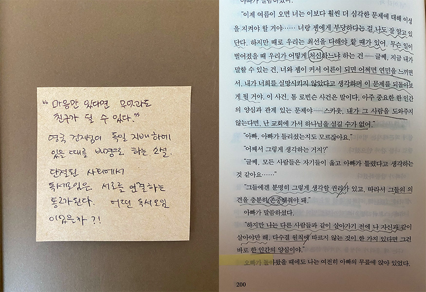 지난주에는 큰딸이 하퍼 리의 《앵무새 죽이기》를 쓱 내밀었다. ‘뒤쪽 면지’에 책에 대한 자기 생각을 기록했다며, 엄마도 읽고 그 옆에 생각을 남겨주었으면 좋겠다는 요청이었다. 밑줄 친 문장과 메모를 보면서 사춘기 딸아이의 고민이 무엇인지, 어떤 생각들이 아이의 마음을 움직이게 하는지 알 수 있었다. 책을 읽고 나니 아이와 대화하며 함께 읽은 느낌이 들었다.