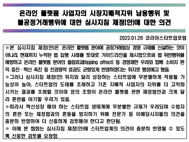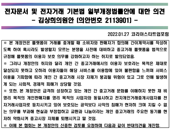 2월, 열심히 준비한 코스포 소식을 전해요!🙇 #49 코스포레터💌 코스포레터는 '스타트업의 성장을 도와 세상을 혁신하는 코리아스타트업포럼' 소식을 월 2회 전합니다. 2022.2.8. 💁 주목할만한 이벤트 # 2022년 정기총회 및 신년 네트워킹 데이 개최 <투-게더타운> 행사 안내 1. 일시 : 2022년 2월 22일(화), 오후 4시 2. 장소 º 현장 참석 : 스타트업브랜치(삼성역) º 온라인 참석 : 온라인 링크 추후 공유 예정 3. 참석대상 : 코리아스타트업포럼 회원사 4. 행사내용 º 1부 (16:00 ~ 16:50) 정기총회 º 2부 (17:00 ~ 18:30) 스타트업 신년 네트워킹 데이 <투-게더타운> - 프로그램 : 토크 세션, 네트워킹 이벤트, 스타트업 부스, THE창업가 콘텐츠 전시 등 5. 의결안건 º 제1호 의안 : 2021년 사업평가 및 결산의 건 º 제2호 의안 : 2022년 사업계획 및 예산(안)의 건 º 제3호 의안 : 이사장 선출의 건 📜 코스포 정책활동 # (1.26) 온라인 플랫폼 심사지침 제정안(공정위)에 대한 의견서 제출 22년 1월 26일, 코스포는 공정위가 행정예고한 "온라인 플랫폼 사업자의 시장지배적지위 남용행위 및 불공정거래에 대한 심사지침 제정(안)"에 대해 반대 입장을 밝히는 의견서를 제출했습니다. ✔️의견서보기: 클릭 # (1.27) 과방위에 전자거래 기본법 일부개정법률안(김상희 의원안)에 대한 의견서 제출 22년 1월 27일, 코스포는 김상희 의원이 발의한 전자문서 및 전자거래 기본법 일부개정법률안에 대한 반대 의견을 과방위 위원장과 과방위 수석전문위원에게 전달했습니다. ✔️의견서보기: 클릭 # (2.4) 스타트업 정책 동향 리포트 Vol.11 발간 코리아스타트업포럼 정책실은 2월 4일, 분야별 이슈를 정리해 새롭게 정책 동향 리포트 및 뉴스레터를 배포했습니다. ✔️리포트보기: 클릭 🔎 THE창업가 인터뷰 프로젝트 💡 온라인 투자 연계 P2P 금융서비스, 이효진 대표(8퍼센트) 💡 Q. 당신이 창업한 '스타트업'을 소개해 주세요. 8퍼센트는 모바일을 통해 자금이 필요한 대출자와 수익을 원하는 투자자를 연결해주는 형태를 갖고 있습니다. 결과적으로 8퍼센트의 심사를 통과한 대출자는 합리적인 대출 이자를 지급하고 자금을 빌릴 수 있고, 이 채권에 투자한 분들은 저금리 시대의 좋은 투자처로 활용할 수 있습니다. Q. 창업을 결심하게 된 계기, 혹은 이유는 무엇인가요? 이 사업을 시작하기 전에 은행에 8년간 근무했었어요. 창구에서 고객상담을 하면서 늘 은행이 서비스하지 못하는 고객님들이 많이 계시고, 그래서 아쉬운 마음이 있었는데요. 그분들이 어떤 금융 서비스를 쓰시나 봤더니 20% 이상의 고금리 대출을 쓰시는 것이었습니다. 시장의 불합리함을 느끼던 와중에 은행을 그만두고 친구랑 차를 마시면서 이야기를 나누다가 해외에서 P2P금융 산업이 크게 성장하고 있다는 이야기를 듣게 됐습니다. ‘아! 우리나라에 꼭 필요한 서비스다!’라는 확신으로 서비스를 운영하게 됐습니다. Q. 창업 과정에서 소소하더라도 행복감을 느낀 경험이 있나요? 8퍼센트는 지난 2014년 11월, 국내 1호 중금리 전문 플랫폼으로 설립됐습니다. 사업 초기, 금융당국에 의해 불법 사이트로 오인받아 폐쇄당하는 우여곡절을 겪었으나, 금융감독원 핀테크지원센터의 도움으로 사업구조를 정비하고 서비스를 재개할 수 있었습니다. 이어, 중소기업청(現 중소벤처기업부)이 P2P 대출 기업에 VC 투자가 가능해지도록 규정을 마련하면서 P2P 대출을 활성화시킬 발판을 마련할 수 있었고 5년이 지난 현재 관련 산업을 제도권 금융으로 편입시킬 수 있었습니다. 시대의 수요를 부응하는 새로운 산업이라 하더라도, 발걸음을 떼는 것에는 복합적인 이해관계와 정밀한 커뮤니케이션이 필요함을 느낄 수 있었습니다. Q 후배 혹은 동료 창업가에게 하고 싶은 이야기? 이 일을 정말 하고 싶은지, 그리고 인내의 시간을 견딜 준비가 돼 있는지 숙고해보면 좋겠습니다. 막상 사업을 시작하면 생각한 계획 그대로 진행되지 않을 수 있습니다. 1년을 열심히 하면 될 것 같았는데 3년, 5년, 10년이 걸릴 수 있습니다. 정말 하고 싶은 일이 맞는지, 가치 있는 사업을 운영한다는 사명감을 꾸준히 가질 수 있을지 자문해보면 좋겠습니다. 그다음으로 드리고 싶은 말은 남과 다른 삶을 선택한 만큼 그에 따르는 어려움을 잘 이겨내야 한다는 점입니다. 핀테크뿐 아니라 다양한 분야로 창업을 하는 분들이 많아졌으면 합니다. Q. 당신이 생각하는 ‘창업가 정신'은 무엇인가요? 좋은 아이디어를 가진 사람들은 많습니다. 다만, 이것을 더 정교하게 최적화시키고 따뜻한 시선으로 세상을 바라보며 사업 모델에 집착하는 것이 창업가들에게 필요한 부분이라고 생각합니다. #인내 #집요함 #정교함 👀 알면 도움될 정보 # 코스포 프로모션 코스포 회원사만을 위해 준비한! 다양한 혜택이 담겨있는 프로모션을 놓치지 마세요.🙋 2월 프로모션집도 곧 발송되오니, 많은 관심 부탁드립니다. 2022년에도 코스포 회원사만을 위한 프로모션은 쭈-욱 계속되어요!🎤 😎 ✔️문의: 스타트업커뮤니티성장실 # 스타트업 정기주총 A to Z 완벽정리 웨비나 스타트업들은 다가오는 3월 정기 주주총회와 관련해서 여러가지 고민이 생기시는 시점